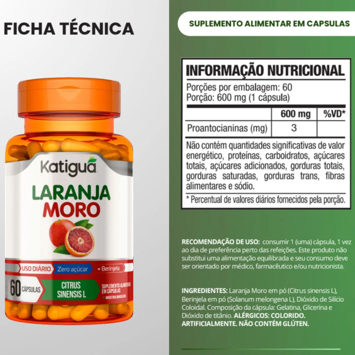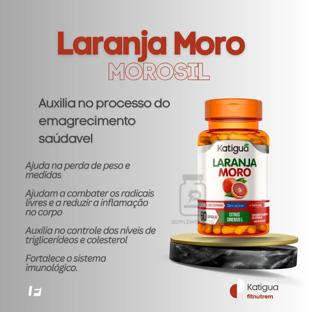 O Laranja Moro Katiguá é um suplemento alimentar formulado com extrato da laranja vermelha (Citrus sinensis), rica em compostos antioxidantes como antocianinas e vitamina c. Sua formulação auxilia na proteção das células contra os radicais livres e é uma excelente opção para complementar uma rotina saudável e equilibrada.