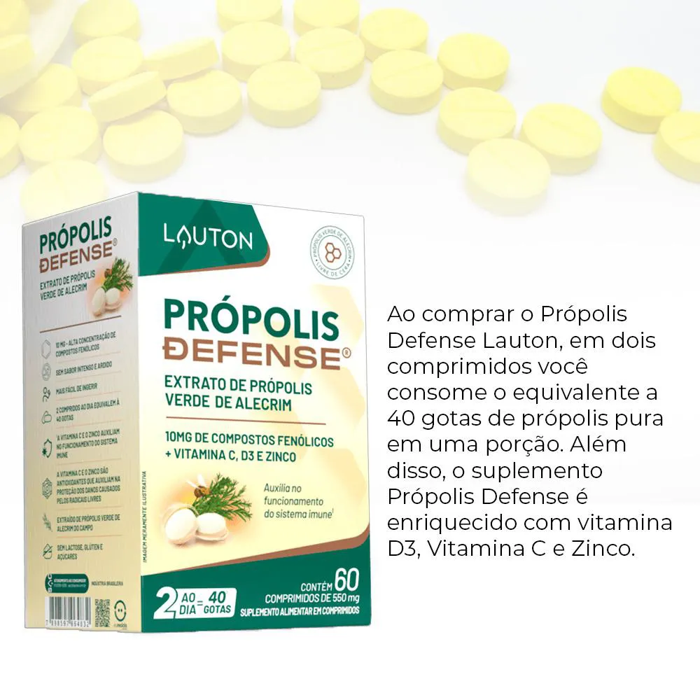 Os comprimidos de Própolis Defense Lauton são fáceis de ingerir, proporcionando uma experiência de consumo conveniente. A apresentação em comprimidos facilita a inclusão deste suplemento em sua rotina diária, permitindo um consumo simples e direto. Ideal para quem busca praticidade sem comprometer a qualidade.