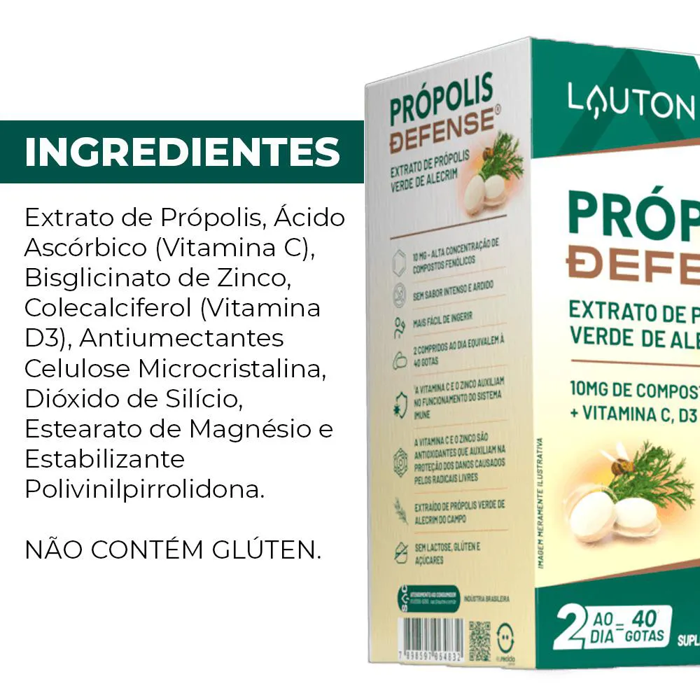 Cada comprimido de Própolis Defense Lauton contém extrato verde de própolis e alecrim, ingredientes cuidadosamente selecionados por sua qualidade e pureza. A formulação é projetada para garantir um suplemento confiável e de alta qualidade. A combinação desses elementos naturais assegura uma suplementação equilibrada. Validade longa