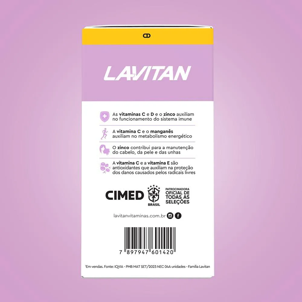 Suplemento Lavitan 50+ Mulher Kit 3 - 60 Comprimidos – Cimed Desenvolvido para mulheres com 50 anos ou mais que desejam complementar a alimentação com vitaminas e minerais específicos. Composição principal: Contém diversas vitaminas e minerais, entre os quais: vitaminas do complexo B, vitaminas A, C, D, E, K; minerais como ferro, zinco, manganês, selénio.