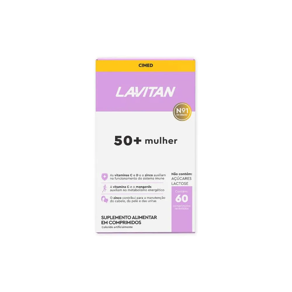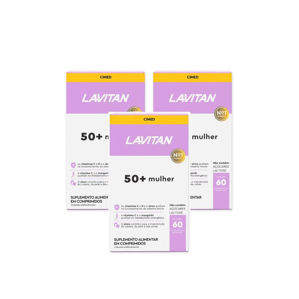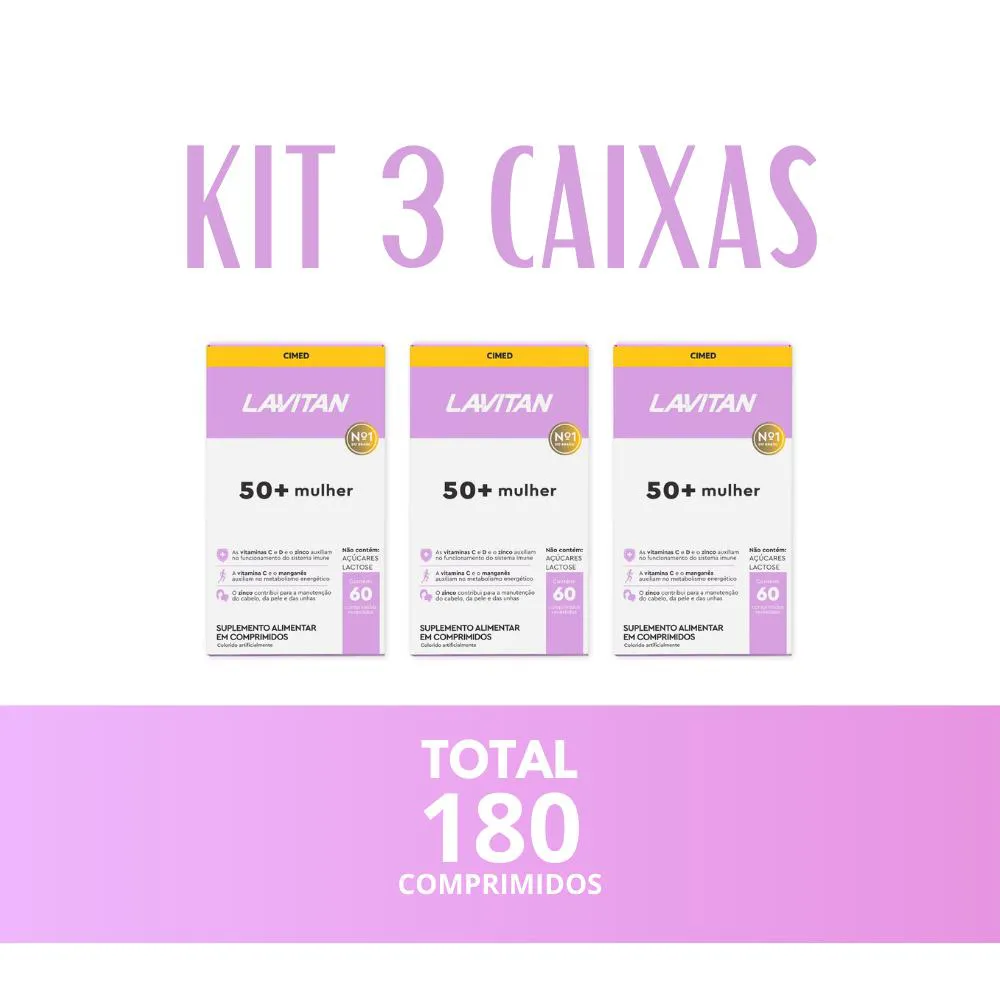 Suplemento Lavitan 50+ Mulher Kit 3 - 60 Comprimidos – Cimed Desenvolvido para mulheres com 50 anos ou mais que desejam complementar a alimentação com vitaminas e minerais específicos. Composição principal: Contém diversas vitaminas e minerais, entre os quais: vitaminas do complexo B, vitaminas A, C, D, E, K; minerais como ferro, zinco, manganês, selénio.
