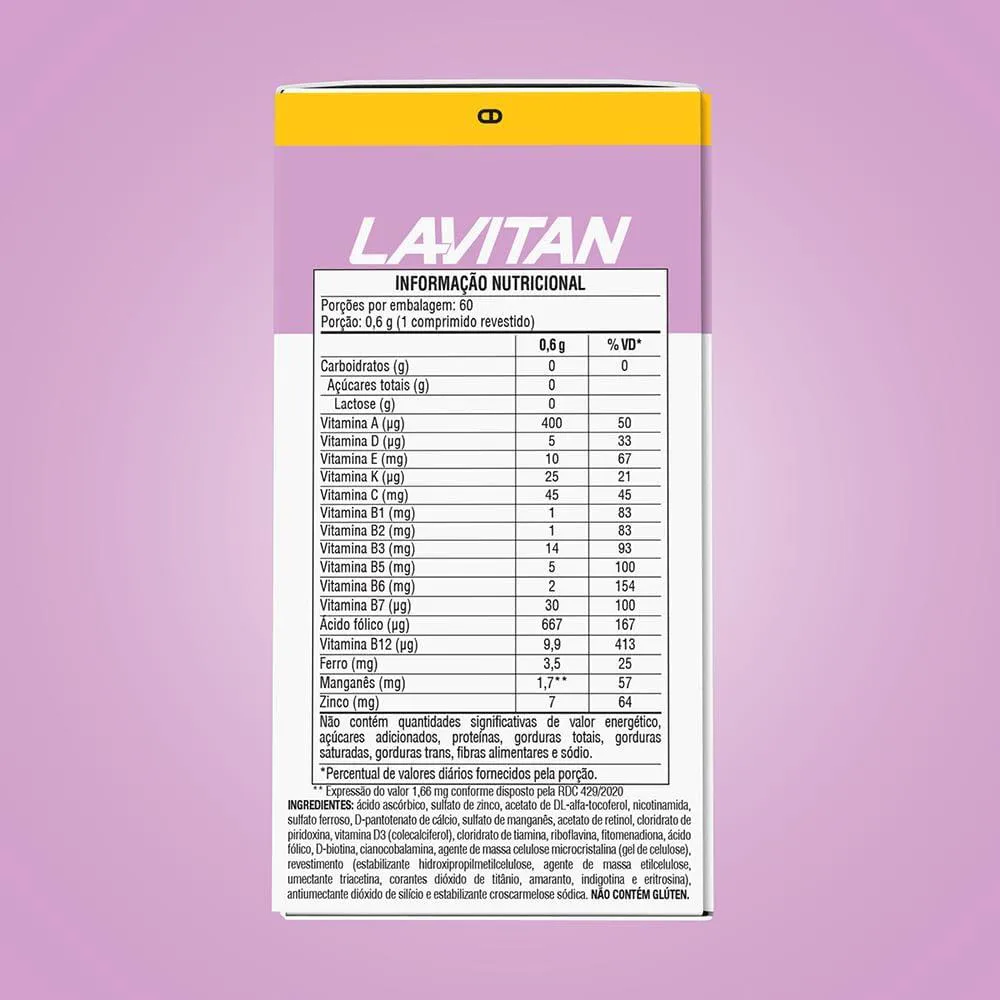 Exemplo de valores por comprimido: vitamina c 45 mg (100% VD), Ferro 10 mg (71% VD), vitamina A 600 µg (100% VD), Manganês 2,3 mg (100% VD) etc. Apresentação e modo de uso: - Frasco com 60 comprimidos revestidos. - Ingerir 1 comprimido ao dia com água ou outro líquido de preferência. - Uso oral para maiores de 19 anos. Informações adicionais / características: - Sem adição de açúcares. - Sem glúten. - Livre de lactose, conforme informação de alguns distribuidores. - Produto isento de registro conforme RDC 27/10. Precauções / Advertências: - Não é medicamento — suplementa dietas com ingestão insuficiente de vitaminas e minerais. - Não exceder a recomendação diária de consumo indicada na embalagem. - Mantenha fora do alcance de crianças. - Gestantes, nutrizes e crianças devem utilizar sob orientação de nutricionista ou médico. - Conservar em local seco, protegido da luz e umidade, conforme instruções da embalagem. Precauções de uso: - Como todo suplemento alimentar, sua utilização deve ser acompanhada de alimentação equilibrada e hábitos de vida saudáveis. - Não substitui avaliação médica ou nutricional. - A marca informa que “não existem evidências científicas comprovadas de que este alimento previna, trate ou cure doenças”. SOBRE A LOJA: Somos a rede de farmácias mais antiga de São José dos Pinhais, atuando no ramo farmacêutico desde 1990 com comprometimento à qualidade e satisfação do cliente. É um prazer compartilhar os nossos valores e as nossas conquistas com quem confia no nosso trabalho! Imagens dos Produtos são Meramente Ilustrativas. Todas as Informações Divulgadas são de Responsabilidade Exclusiva do Fabricante/fornecedor.