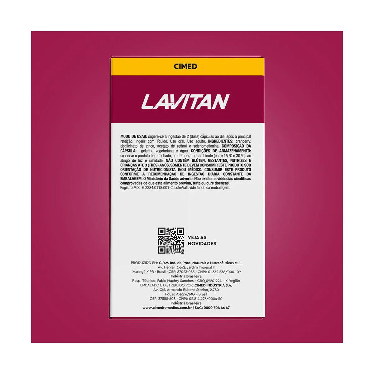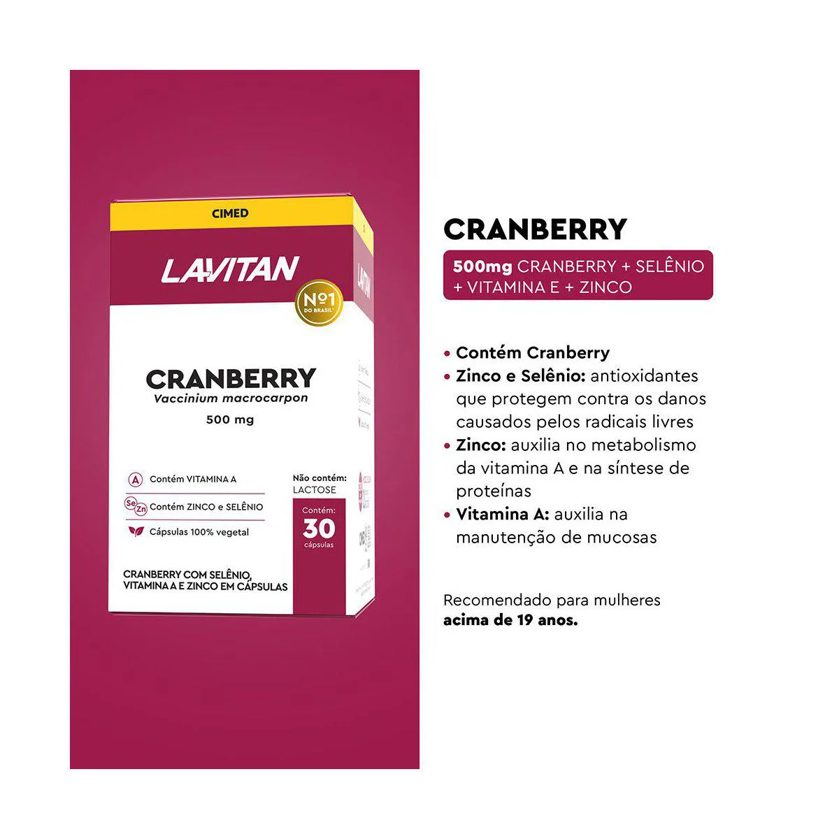 Lavitan Cranberry é um suplemento alimentar em cápsulas enriquecido com Cranberry em seu estado puro, além de outros nutrientes como selênio, vitamina A e zinco. Sua fórmula é 100% vegetal, além de ser zero lactose, glúten e calorias.