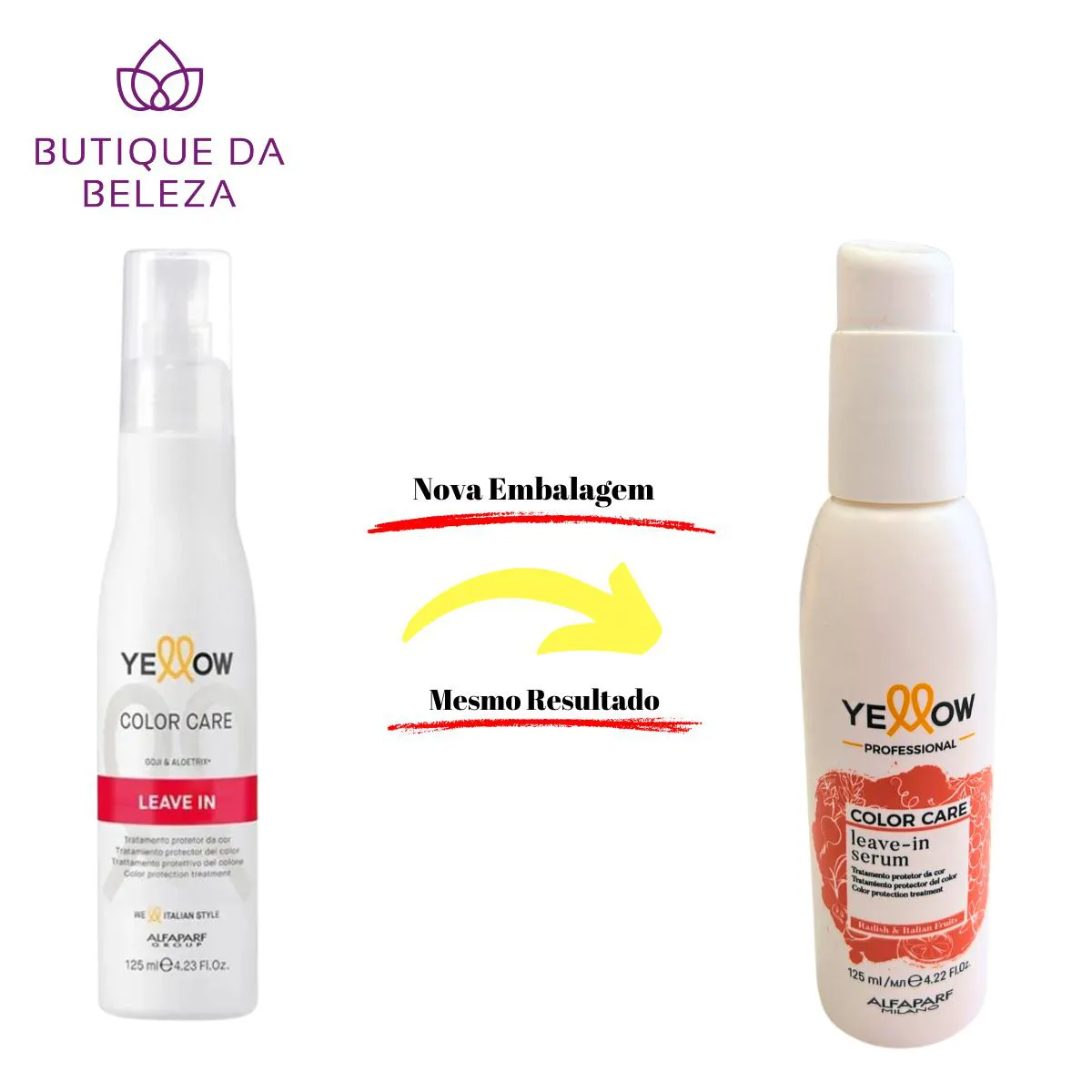 Somos a BUTIQUE DA beleza Uma empresa especializada no comércio de Cosméticos e Semijoias. Estamos sempre entre os Melhores Vendedores. NOSSO COMPROMISSO É COM VOCÊ! SEU CONFORTO E SEGURANÇA SÃO NOSSOS PROPÓSITOS SERVIR E AJUDAR SÃO NOSSOS DEVERES APRESENTAÇÃO DA LINHA YELLOW COLOR CARE O ALIADO PERFEITO PARA OS CABELOS PINTADOS, NO SALÃO E EM CASA. EXALTA E PRESERVA NO TEMPO A INTENSIDADE E O BRILHO DE CADA COR. DEPOIS DE 1 MÊS, COR COMO RECÉM APLICADA* - 85% DA INTENSIDADE LUMINOSIDADE AMPLIADA* - +41% DEPOIS DE UM SÓ TRATAMENTO* LEAVE-IN SERUM YELLOW COLOR CARE Tratamento protetor da cor SÉRUM ULTRALEVE QUE AJUDA A PROLONGAR A INTENSIDADE E A LUMINOSIDADE DA COR, PROTEGENDO O cabelo DAS AGRESSÕES EXTERNAS. MODO DE USO DISTRIBUIR NO COMPRIMENTO E NAS PONTAS. PROCEDER À SECAGEM E/OU AO PENTEADO. DICA: PODE SER APLICADO TAMBÉM EM CABELOS SECOS. EMBALAGEM FRASCO 125 ML