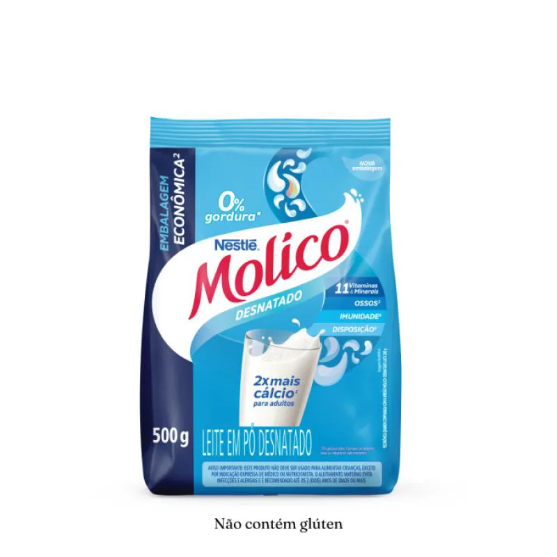 MOLICO® Desnatado contém um mix exclusivo de vitaminas e mineiras que ajuda a restaura os nutrientes que os adultos perdem ao longo do dia. O cálcio é um mineral que auxilia na manutenção e saúde dos ossos. Leite em pó desnatado. Rico em cálcio. Mix exclusivo de vitaminas e minerais. Não contém glúten. Sachet 500g.O MINISTÉRIO DA SAÚDE INFORMA: O ALEITAMENTO MATERNO EVITA INFECÇÕES E ALERGIAS E É RECOMENDADO ATÉ OS 2 (DOIS) ANOS DE IDADE OU MAIS.