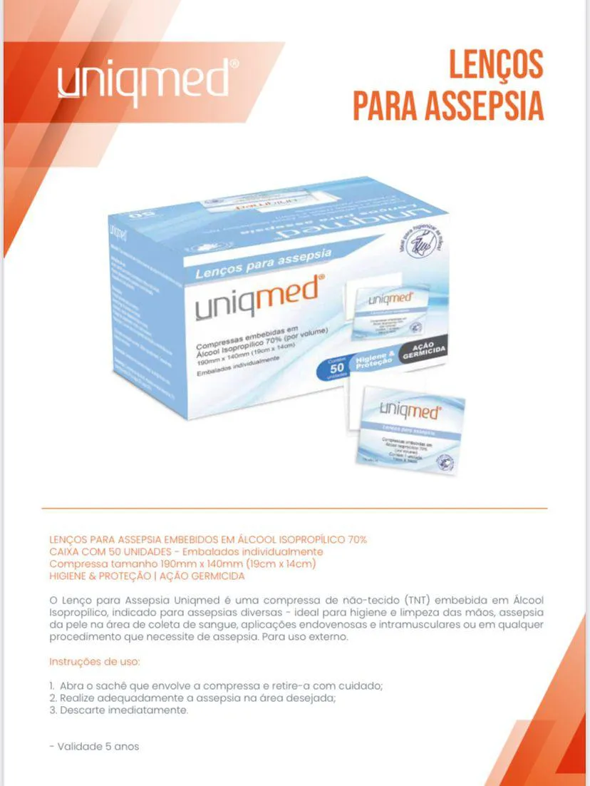 Os Lenços para Assepsia Embebidos em Álcool Isopropílico 70% da Uniqmed são essenciais para garantir higiene e proteção em procedimentos diversos. O kit contém 50 unidades, cada uma embalada individualmente, oferecendo praticidade e segurança. Com tamanho de 19cm x 14cm, essas compressas de não-tecido (TNT) são ideais para a limpeza das mãos, assepsia da pele em áreas de coleta de sangue, aplicações endovenosas e intramusculares, além de outros procedimentos que necessitem de desinfecção. Para usar, abra o sachê que envolve a compressa e retire-a com cuidado. Realize a assepsia na área desejada e descarte a compressa imediatamente após o uso. Com ação germicida eficaz, estes lenços são indicados para uso externo e têm validade de 5 anos. Este produto é registrado no Ministério da Saúde sob o número de processo 23351.418244/2020-48, assegurando sua qualidade e conformidade com as normas de saúde.