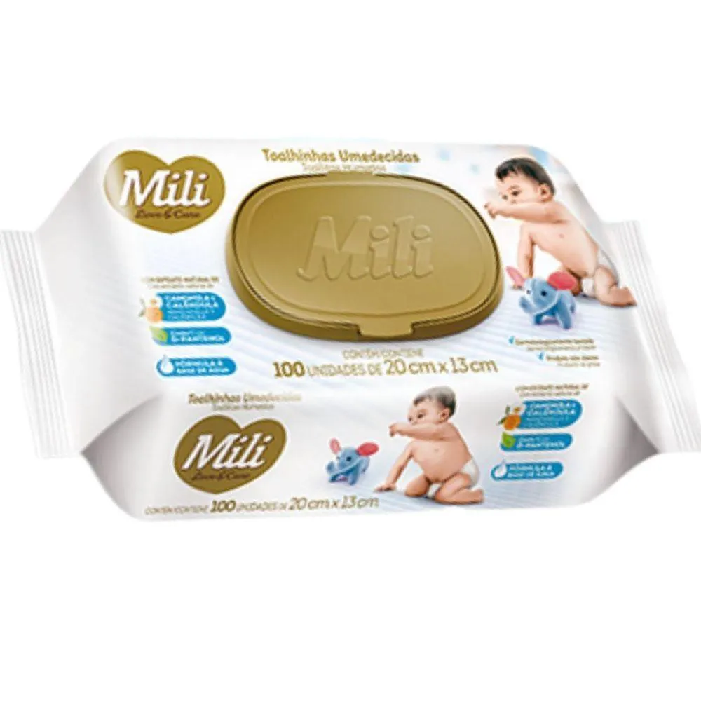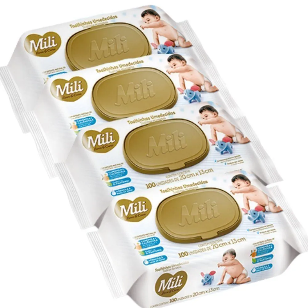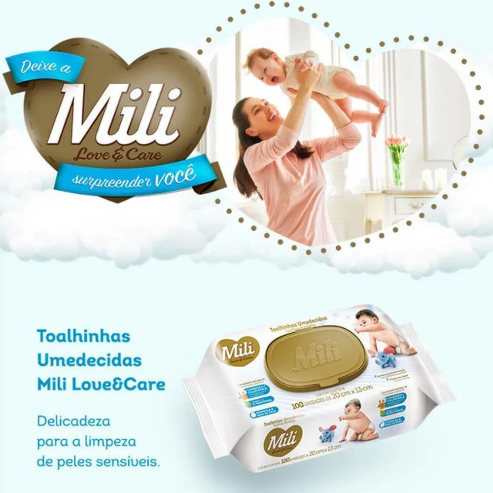Toalhinhas Umedecidas Love & CareQuantidade: 4 Pacotes com 100 unidades (total: 300)Marca: MILIMedida: 20cm x 13cmDelicadeza para a limpeza de peles sensíveisFaça a limpeza do seu bebê com a delicadeza, proteção e suavidade da linha de toalhinhas umedecidas premium da Mili Love & Care.Um produto não oleoso, comD-Pantenol e textura que proporciona a higiene com menos assaduras.- Dermatologicamente testado- Extrato natural deCamomila e Calêndula- Fórmula a base deÁgua