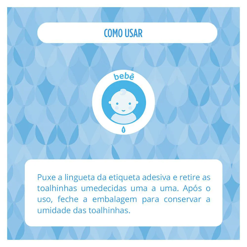 Puxe a lingueta da etiqueta adesiva e retire as toalhinhas umedecidas uma a uma. Após o uso, feche a embalagem para conservar a umidade das toalhinhas.