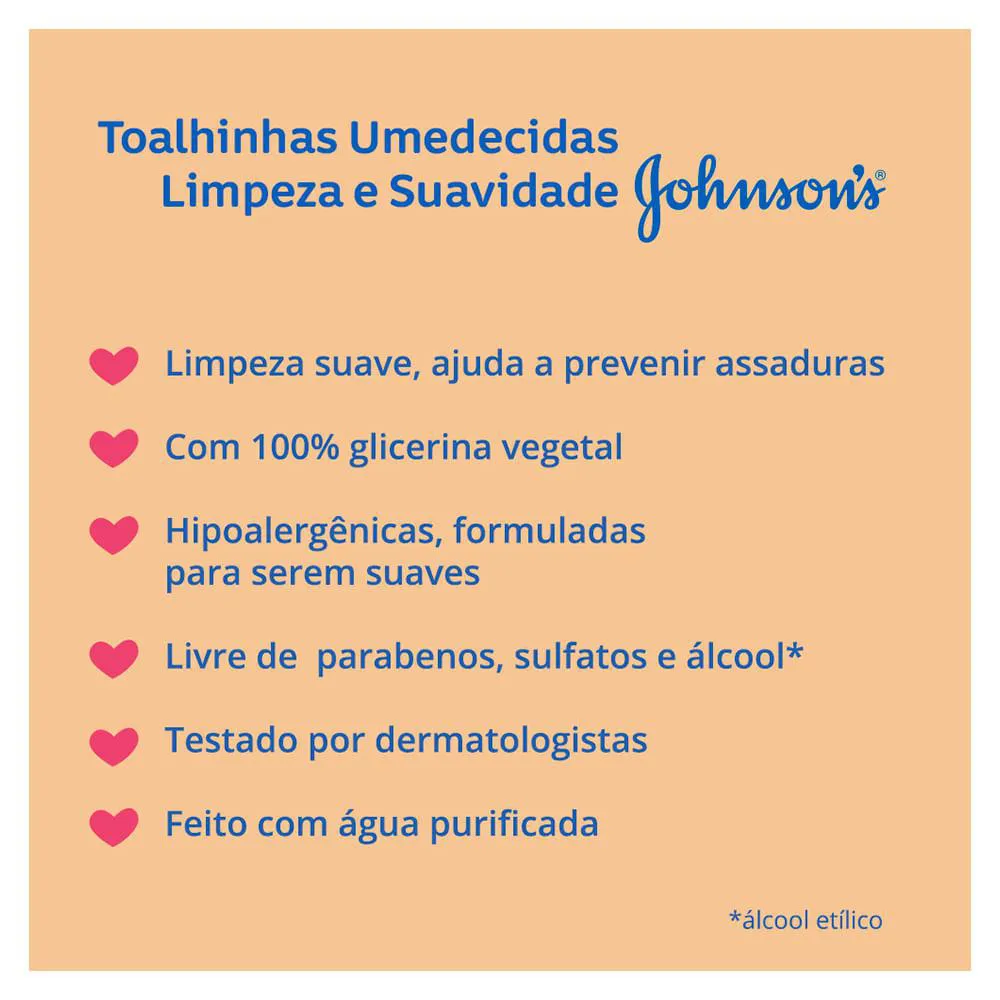 As toalhinhas umedecidas Johnson's Limpeza e Suavidade foram desenvolvidas especialmente para a pele dellicada do bebê. Sua fórmula contém extrato de Própolis e Chá Verde, removendo delicadamente as sujeiras da pele, até aquelas que não podem ser vistas. Pode ser usado diramente, e não resseca a pele. Dermatologicamente testado e hipoalergênico.