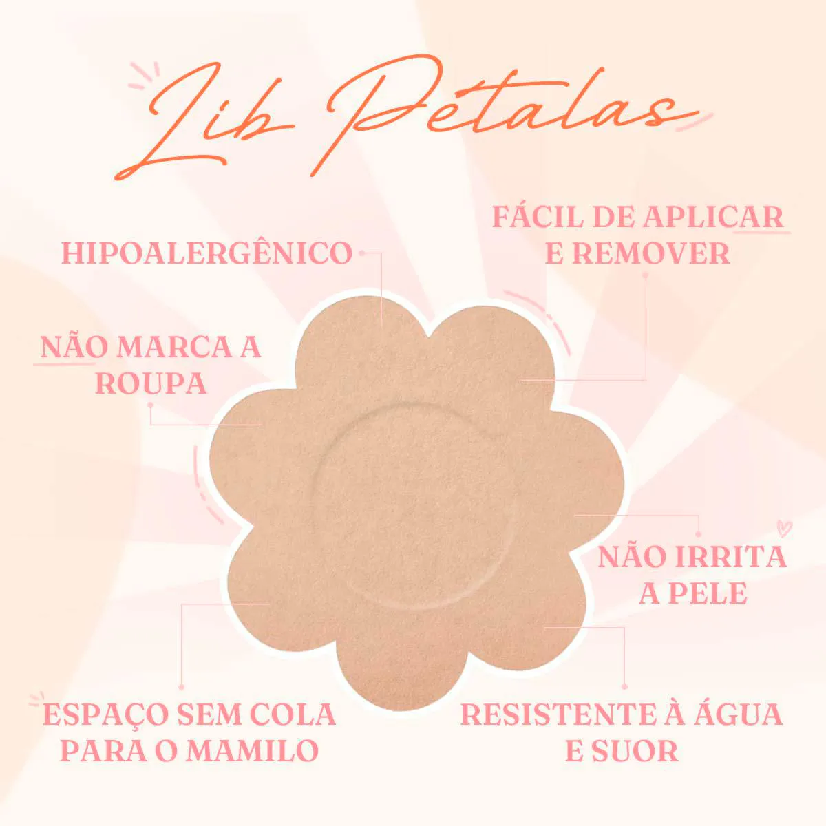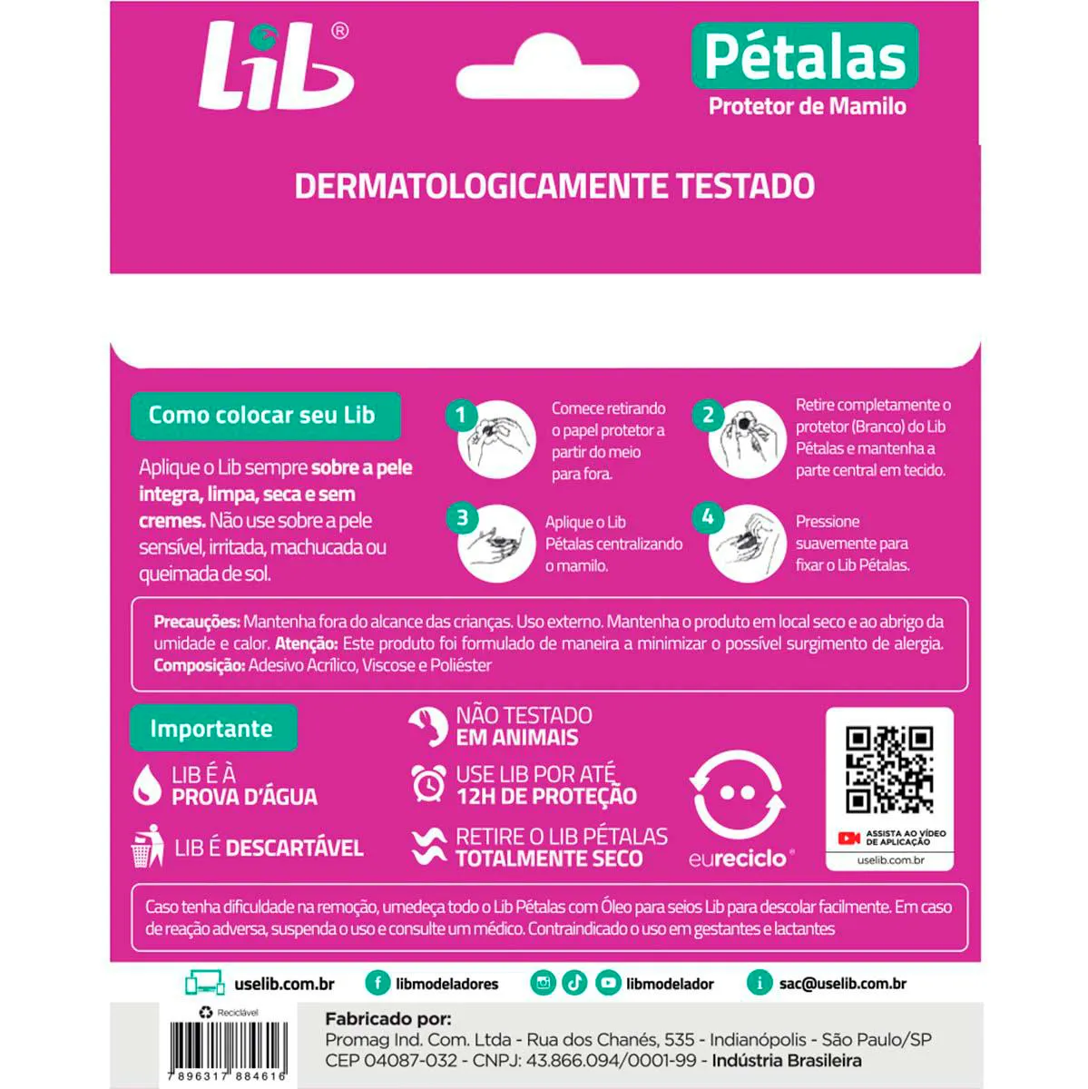 Para que serve: O Lib Pétalas Protetora de Seios pode ser utilizado apenas uma vez, após retirado não aderirá a pele novamente, mesmo que você tenha acabado de colocar. Confeccionado em adesivo hipoalergênico e tecido microporoso, para que a pele possa respirar. Sua fixação te deixa segura e protegida por até 12 horas.