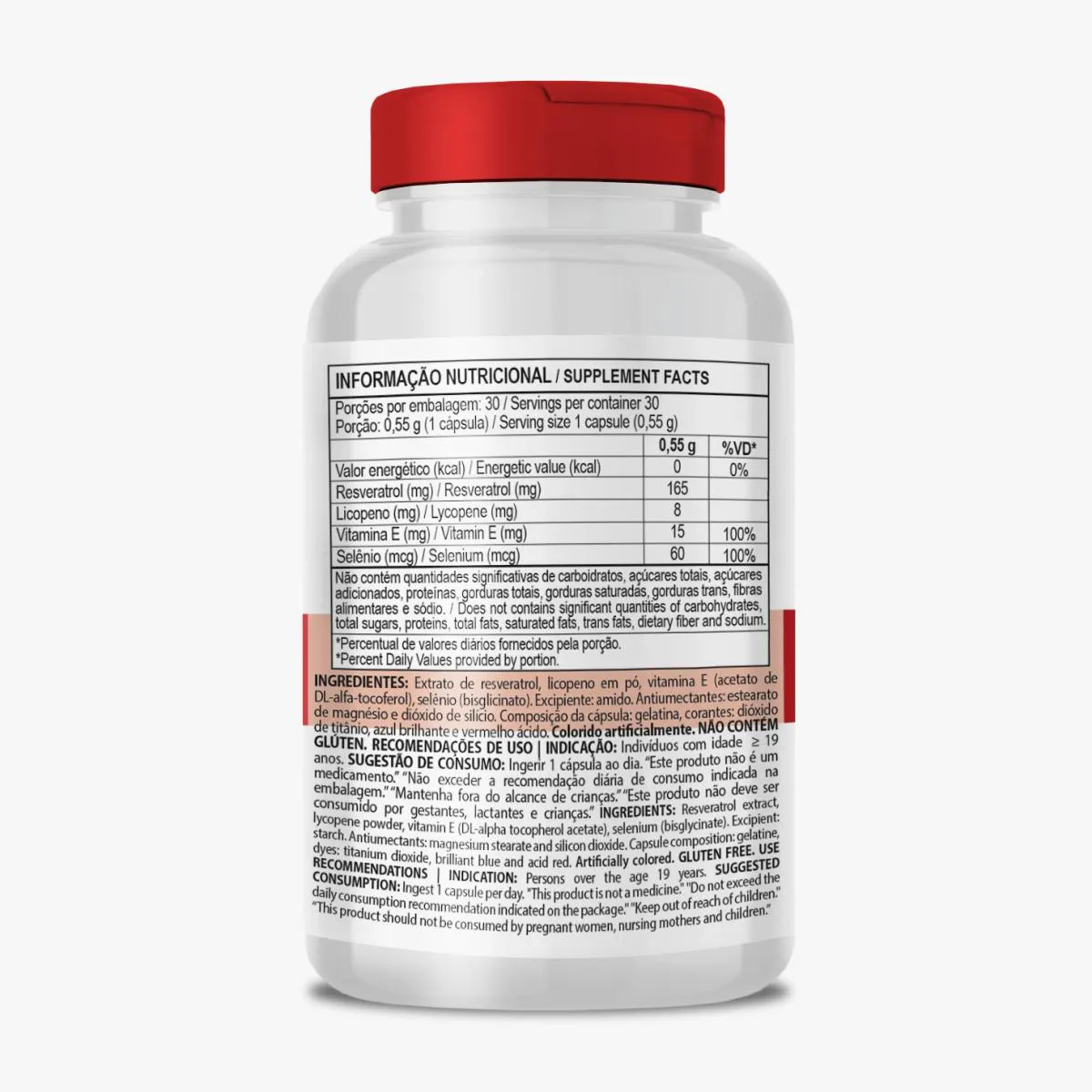 Licopeno 550mg Clinicmais 30 Cápsulas É um suplemento alimentar em cápsulas que contém licopeno. O licopeno é um carotenóide que dá a cor vermelha ao tomate, goiaba, melancia e outros alimentos. É conhecido por suas propriedades antioxidantes, que ajudam a combater os radicais livres que causam danos às células do nosso corpo. Recomendação de uso: Ingerir 1 cápsula ao dia. Indicação: Indivíduos com idade ≥ 19 anos. Ingredientes: Extrato de resveratrol, licopeno em pó, vitamina e (acetato de DL-alfa-tocoferol), selênio (bisglicinato). Composição da cápsula: gelatina, corantes: dióxido de titânio, azul brilhante e vermelho ácido. colorido artificialmente. NÃO CONTÉM GLÚTEN. "Este produto não é um medicamento.""Não exceder a recomendação diária de consumo indicada na embalagem.""Mantenha fora do alcance de crianças.""Este produto não deve ser consumido por gestantes, lactantes e crianças." Produto dispensado de registro de acordo com a RDC n°240 de 26/07/2018.