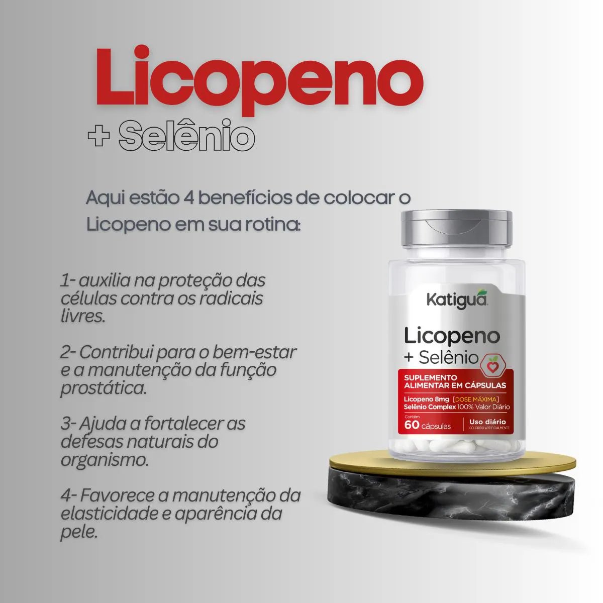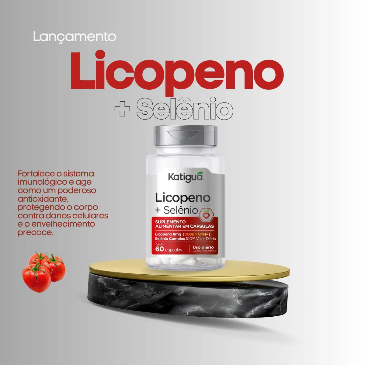 Suplemento alimentar formulado com licopeno e selênio, nutrientes reconhecidos por sua ação antioxidante.Benefícios: