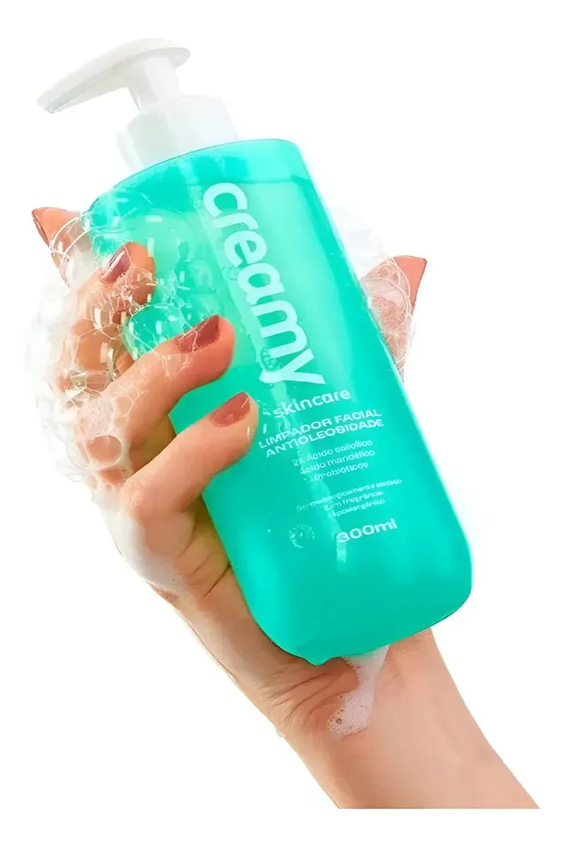 O Limpador Facial Antioleosidade da Creamy é formulado com uma combinação de ácido mandélico e ácido salicílico. Estes ativos, quando combinados, auxiliam na remoção do excesso de oleosidade. Enriquecido com glicerina e prebióticos, este limpador também ajuda no controle do brilho e na preservação da barreira da pele. Principais Ativos Ácido Mandélico Ácido Salicílico Prebióticos Glicerina Principais Benefícios Promove limpeza profunda Ajida na remoção do excesso de oleosidade Ajuda no controle do brilho e da oleosidade da pele Contribui para preservação da barreira cutânea Ajuda a evitar a formação de acne Indicação Para todos os tipos de pele Modo de uso Aplique um pump sobre a pele úmida e massageie até obter uma espuma leve. Enxágue em seguida. Use de 1 a 2 vezes ao dia