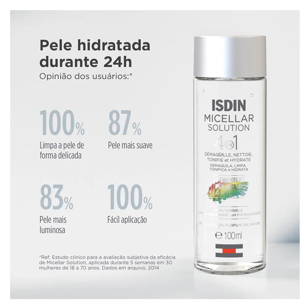 ISDIN Micellar Solution deixa a pele hidratada por até 24h, logo após a primeira aplicação. E além disso, possui eficácia comprovada. 91% das usuárias afirmou que limpa sem agredir a pele, 80% disse que deixa a pele mais aveludada, 62% relatou que a pele fica mais radiante e 100% disse que o produto é fácil de usar.