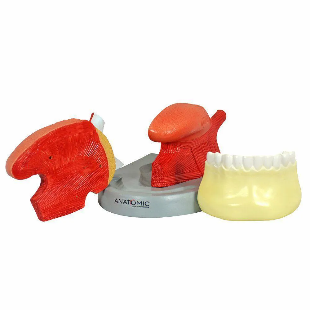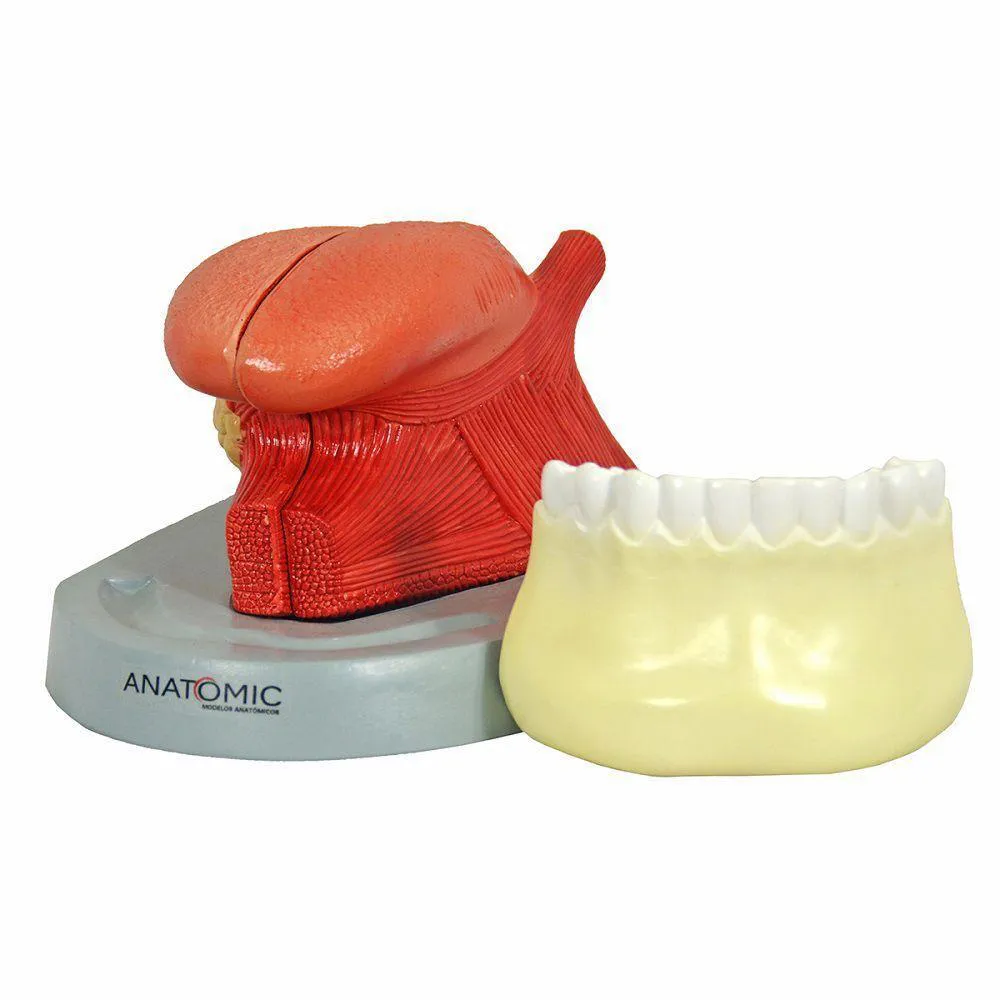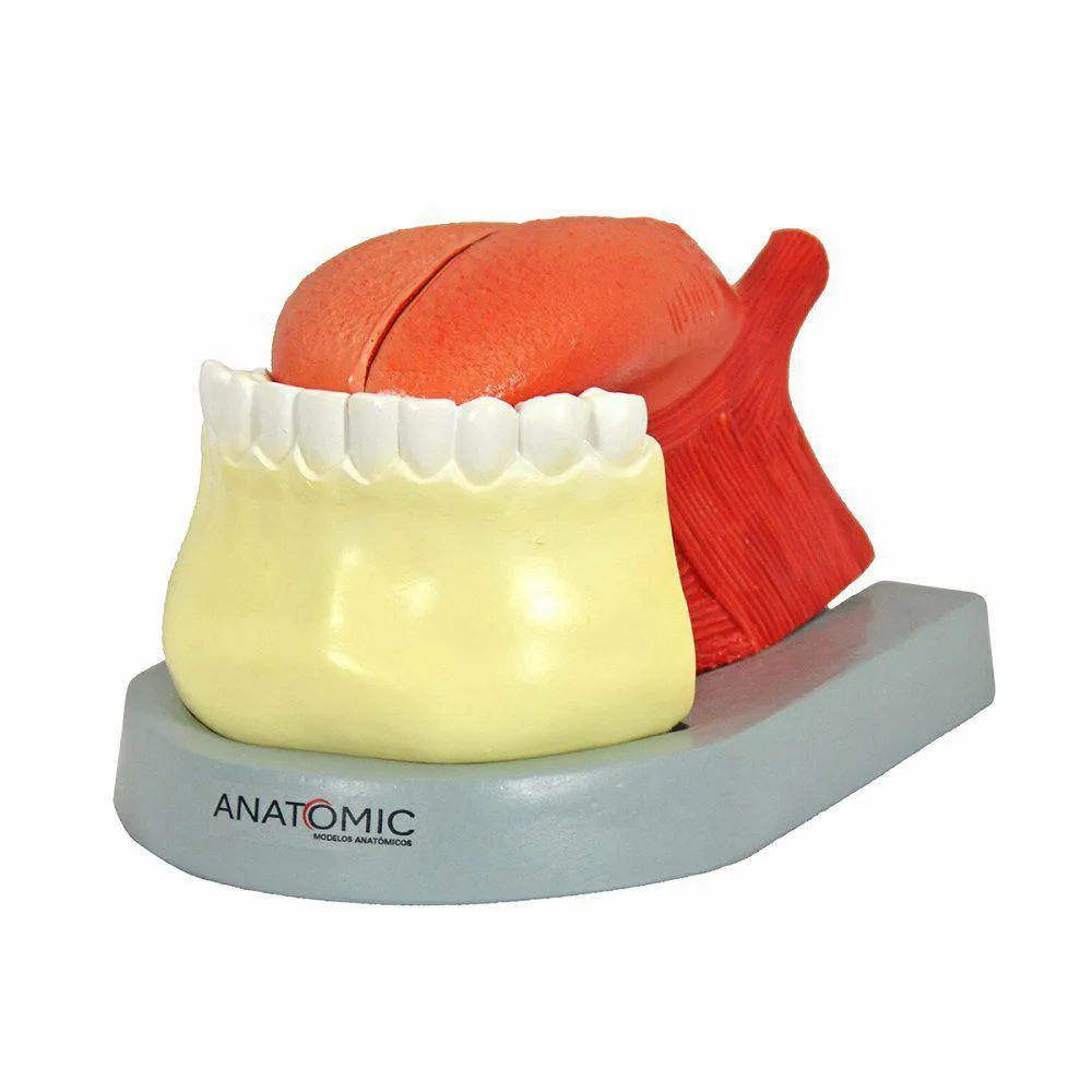 Modelo anatômico da língua, ampliado aproximadamente 4 vezes tamanho natural, desmontável em 3 partes. Evidencias as estruturas que compõem a língua, musculatura sublingual, glândula sublingual e submandibular, parte da mandíbula e dentes incisivos inferiores. Confeccionado em resina plástica rígida. Acompanha suporte. Composto por:- Língua,
