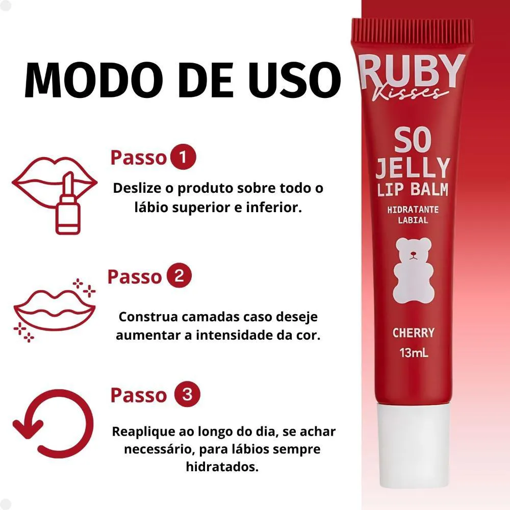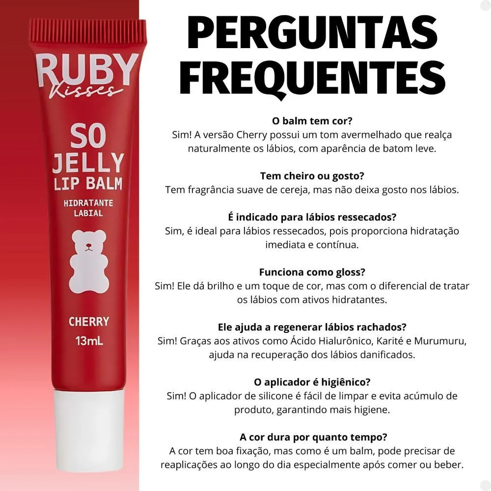 Lip Balm Ruby Kisses So Jelly Cherry Experimente a hidratação intensa de um balm com cor de batom. Sua textura leve e não pegajosa proporciona conforto duradouro, enquanto o aplicador de silicone anatômico garante uma aplicação fácil e precisa. Enriquecido com Óleo de Semente de Jojoba, Ácido Hialurônico, Manteiga de Karité, Manteiga de Murumuru e Óleo de Rícino, oferece hidratação profunda e prolongada. Pode ser usado sozinho ou combinado com lápis de boca para um acabamento perfeito. Vegano e livre de crueldade animal. . Modo de Uso Deslize o produto sobre todo o lábio superior e inferior, construindo camadas caso deseje aumentar a intensidade da cor. Reaplique ao longo do dia, se achar necessário, para lábios sempre hidratados. Composição Microcrystalline Wax, Hydrogenated Polyisobutene, Tridecyl Trimellitate, Polybutene, Neopentyl Glycol Diheptanoate, Diisostearyl Malate, Phenoxyethanol, Synthetic Wax, Ethyl Vanilin, Tocopheryl Acetate, Butyrospermum Parkii Butter(Shea), Simmondsia Chinensis(Jojoba)Seed Oil, Ricinus Communis (Castor) Seed Oil, Sodium Hyaluronate, Neotame, Astrocaryum Murumuru Seed Butter, Silica, Hydrogenated Castor Oil, Parfum, Linalool, CI 77891, CI 77492. . Perguntas Frequentes O balm tem cor? Sim! A versão Cherry possui um tom avermelhado que realça naturalmente os lábios, com aparência de batom leve. A cor dura por quanto tempo? A cor tem boa fixação, mas como é um balm, pode precisar de reaplicações ao longo do dia — especialmente após comer ou beber. É indicado para lábios ressecados? Sim, é ideal para lábios ressecados, pois proporciona hidratação imediata e contínua. Funciona como gloss? Sim! Ele dá brilho e um toque de cor, mas com o diferencial de tratar os lábios com ativos hidratantes. O aplicador é higiênico? Sim! O aplicador de silicone é fácil de limpar e evita acúmulo de produto, garantindo mais higiene. Ele ajuda a regenerar lábios rachados? Sim! Graças aos ativos como Ácido Hialurônico, Karité e Murumuru, ajuda na recuperação dos lábios danificados. Tem cheiro ou gosto? Tem fragrância suave de cereja, mas não deixa gosto nos lábios. Código de Registro Sanitário (ANVISA) 25351.395733/2024-48 .