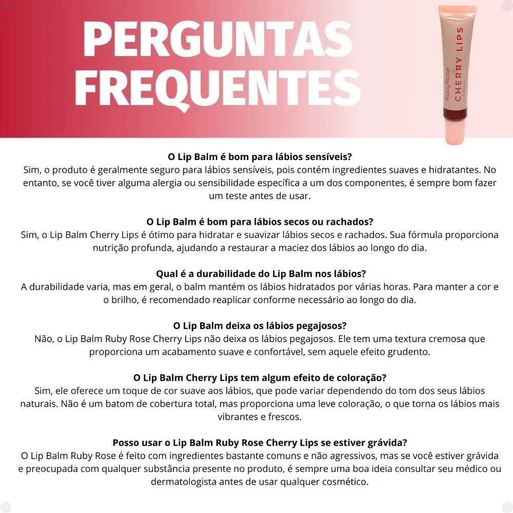 Lip Balm Ruby Rose Cherry Lips CL20 O Lip Balm Cherry Lips da Ruby Rose é um hidratante labial que proporciona cor e brilho aos lábios, além de oferecer hidratação. Um hidratante labial que combina cuidados e beleza ao mesmo tempo em que oferece uma cor suave e um brilho delicado. Este balm não só cuida dos lábios ressecados, mas também oferece um aroma agradável de cereja, que complementa a experiência de uso. É uma ótima opção para quem busca um produto prático para manter os lábios hidratados e com um visual bonito no dia a dia. . Modo de Uso Aplique uma camada generosa nos lábios, preencha todo todo o lábio, superior e inferior. Se necessário, repita a aplicação até obter o efeito desejado. Você pode aplicar o Lip Balm sozinho ou por cima de um batom para dar um efeito a mais. . Composição Paraffinum Liquidium, Tridecyl Trimellitate, Polyisobutene, Hydrogenated Styrene/Isoprene Copolymer, Ethylhexyl Palmitate, Beeswax, Titanium/Titanium Dioxide, Phenoxyethanol, Parfum. Pode Conter: Pigment Red 57:1, CI 45410, CI 15880, CI 77491, CI 77492, CI 77499, CI 15850. . Perguntas Frequentes O Lip Balm é bom para lábios sensíveis? Sim, o produto é geralmente seguro para lábios sensíveis, pois contém ingredientes suaves e hidratantes. No entanto, se você tiver alguma alergia ou sensibilidade específica a um dos componentes, é sempre bom fazer um teste antes de usar. O Lip Balm é bom para lábios secos ou rachados? Sim, o Lip Balm Cherry Lips é ótimo para hidratar e suavizar lábios secos e rachados. Sua fórmula proporciona nutrição profunda, ajudando a restaurar a maciez dos lábios ao longo do dia. Qual é a durabilidade do Lip Balm nos lábios? A durabilidade varia, mas em geral, o balm mantém os lábios hidratados por várias horas. Para manter a cor e o brilho, é recomendado reaplicar conforme necessário ao longo do dia. O Lip Balm deixa os lábios pegajosos? Não, o Lip Balm Ruby Rose Cherry Lips não deixa os lábios pegajosos. Ele tem uma textura cremosa que proporciona um acabamento suave e confortável, sem aquele efeito grudento. O Lip Balm Cherry Lips tem algum efeito de coloração? Sim, ele oferece um toque de cor suave aos lábios, que pode variar dependendo do tom dos seus lábios naturais. Não é um batom de cobertura total, mas proporciona uma leve coloração, o que torna os lábios mais vibrantes e frescos. . Código de Registro Sanitário (ANVISA) 25351.380453/2024-35 .