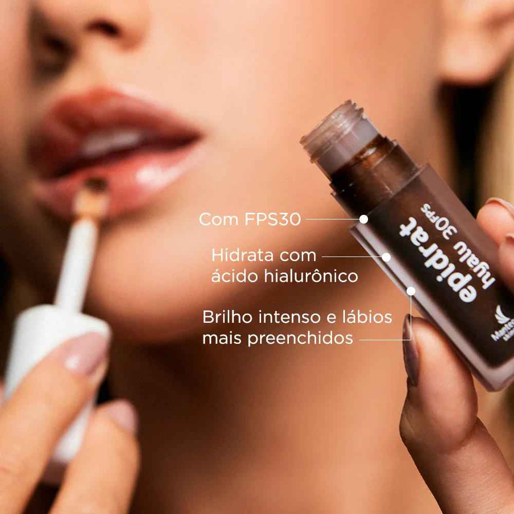 EPIDRAT HYALU LIP OIL FPS 30 chocolate hidrata, proporcionando o briho ideal, volume e preenchimento dos lábios, sem causar desconforto. Reduz os vincos, deixando os lábios realçados e nutridos. Possui ácido hialurónico, vitamina e e óleo de rosa mosgueta, ativos que proporcionam maior poder de hidratação, ação antioxidante e rejuvenescedora. Com tripeptideos que estimulam a produção de colágeno, previne o envelhecimento. O FPS 30 confere proteção contra os raios UVA e UVB. Este produto não é um protetor solar Hipoalergénico. Dermatologicamente testado. Não escorre nos lábios.