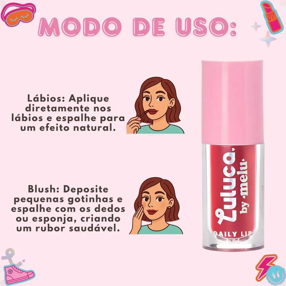 O Lip Tint Luluca By Melu Daily Lip Sweet Rosy é perfeito para todas as ocasiões. Use-o para um look casual no trabalho ou na escola, para um toque de cor em encontros descontraídos ou para realçar sua maquiagem em eventos especiais. Sua versatilidade o torna um aliado indispensável para quem ama um visual leve, natural e cheio de personalidade.Modo de Uso/Aplicação