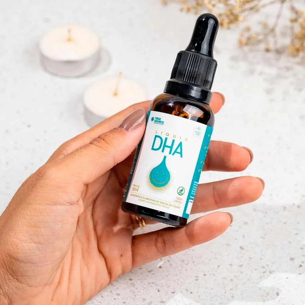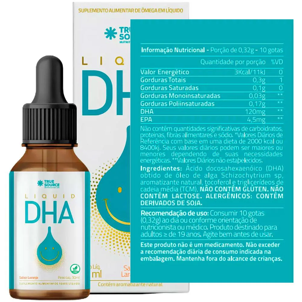 MULTIVITAMÍNICO DHA! Suplemento alimentar de ômega em líquido. O DHA vem com um conta gotas para melhor administração da dose. POSSUI: 120mg de DHA 4,5mg de EPA Derivados de soja NÃO POSSUI: Glúten Corantes Artificiais Lactose DIFERENCIAIS: Vegano Zero contaminantes Odor free Sem sabor residual Gotas translúcidas Zero corante artificial Zero açúcar COMO USAR: Consumir 10 gotas (0,32g) ao dia ou conforme orientação de nutricionista ou médico. Agite bem antes de usar. Advertências: "ESTE PRODUTO NÃO É UM MEDICAMENTO" "ESTE PRODUTO É UM SUPLEMENTO ALIMENTAR" "MANTENHA FORA DO ALCANCE DE CRIANÇAS" "NÃO EXCEDER A RECOMENDAÇÃO DIÁRIA DE CONSUMO INDICADA NA EMBALAGEM" Registro no M.S. nº Produto dispensado de registro RDC 240 de 2018