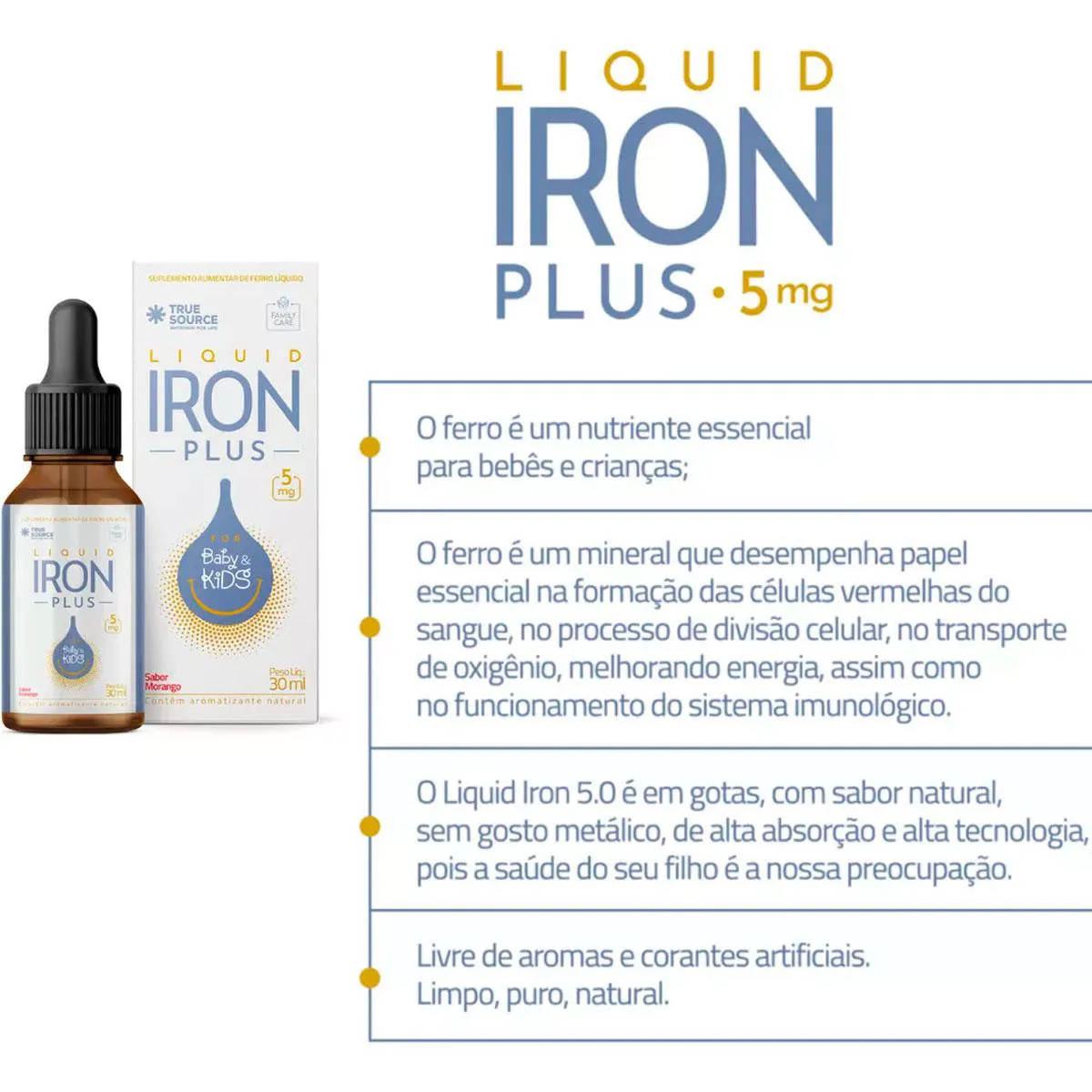 MULTIVITAMÍNICO IRON PLUS LÍQUIDO! O ferro é um dos nutrientes fundamentais para as crianças. Ele é um mineral que desempenha papel essencial na formação das células vermelhas do sangue, no processo de divisão celular, no transporte de oxigênio, melhorando energia, assim como no funcionamento do sistema imunológico. O Liquid Iron Plus da True Source é em gotas com sabor natural e zero corantes artificiais, pois a saúde da sua família é nossa preocupação. Possui: 5mg de Ferro Não possui: Glúten Corantes Artificiais Açúcares adicionados Lactose COMO USAR: Consumir 5 gotas (0,3 ml) ao dia ou conforme orientação do médico e/ou nutricionista. Indicado para bebês a partir de 0 meses, crianças e adolescentes. Advertências: "ESTE PRODUTO NÃO É UM MEDICAMENTO" "ESTE PRODUTO É UM SUPLEMENTO ALIMENTAR" "MANTENHA FORA DO ALCANCE DE CRIANÇAS" "NÃO EXCEDER A RECOMENDAÇÃO DIÁRIA DE CONSUMO INDICADA NA EMBALAGEM" Registro no M.S. nº Produto dispensado de registro RDC 240 de 2018