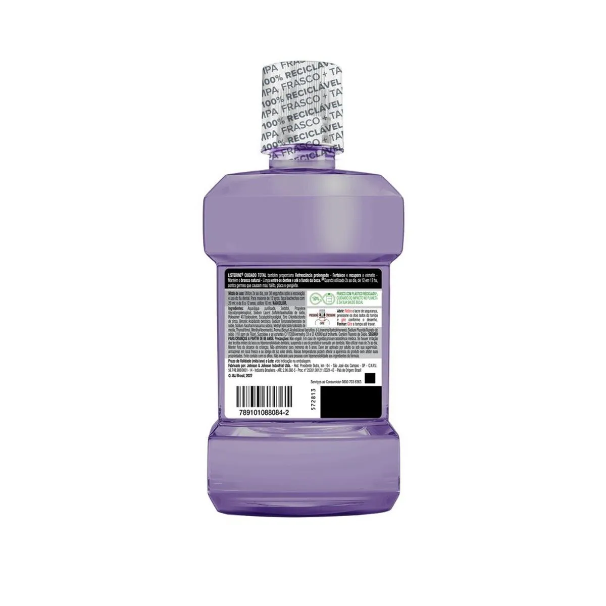 O Listerine Cuidado Total Zero Álcool é um enxaguante bucal sem álcool, com sabor suave e fórmula exclusiva que previne tártaro, fortalece os dentes e elimina até 99,9% dos germes causadores de placa bacteriana, gengivite e mau hálito. Serve como complemento da higiene bucal, sendo utilizado idealmente após a escovação dos dentes, uso do fio dental e raspador de língua, proporcionando uma higiene bucal mais completa em apenas 30 segundos de bochecho.