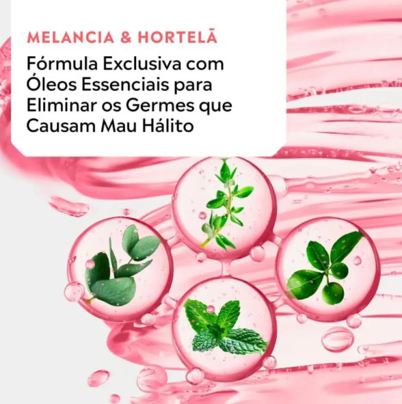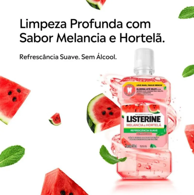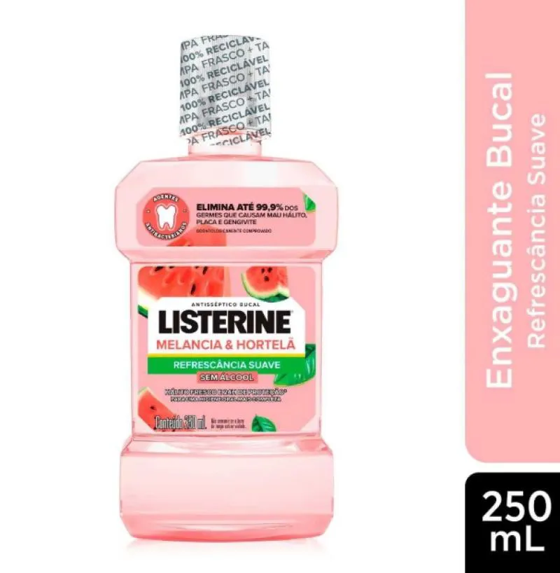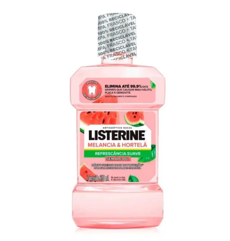 Listerine é um enxaguante bucal sem álcool feito por uma marca especialista em enxaguante bucal há mais de 140 anos. Oferecendo refrescância suave de melancia & hortelã, este é um produto 100% reciclável (frasco e tampa) e feito com 50% de plástico reciclado. Ideal para uma higiene bucal mais completa, Listerine garante maior proteção contra mau-hálito, placa e gengivite, trazendo uma fórmula exclusiva com agentes antibacterianos que mata até 99,9% dos germes que causam os principais problemas bucais. O resultado: hálito fresco e 24 horas de proteção com o uso a cada 12 horas.