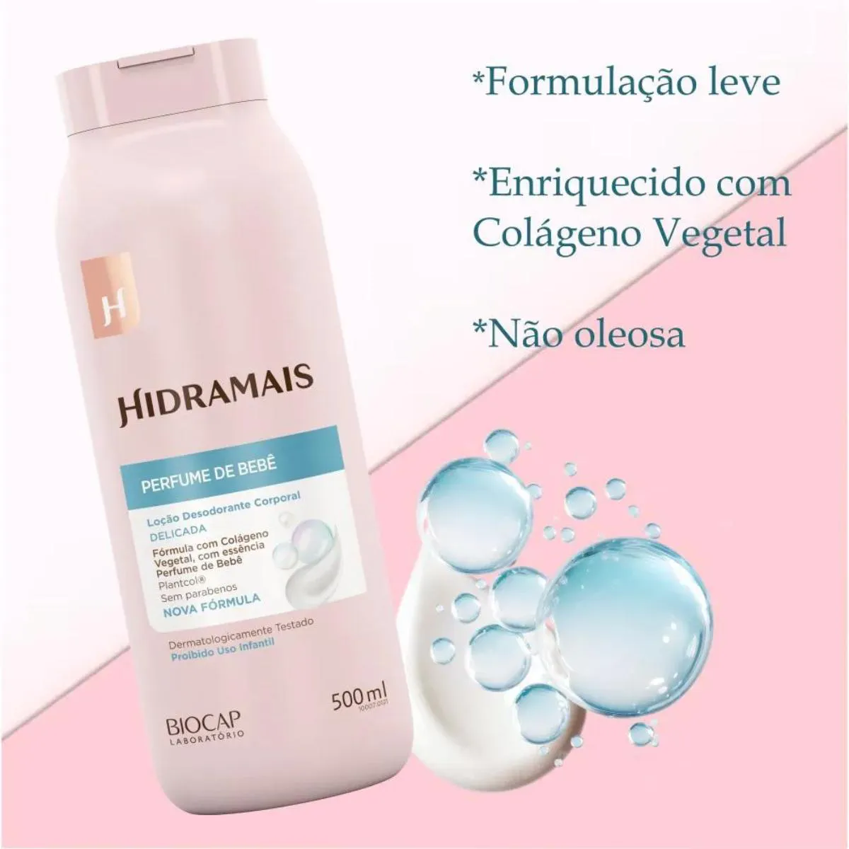 Loção Desodorante Perfume de Bebê Hidramais, possui formulação leve, não oleosa e é enriquecida com colágeno Vegetal. Tem ação desodorante e hidratante. Deixa a pele com toque suave e levemente perfumada.