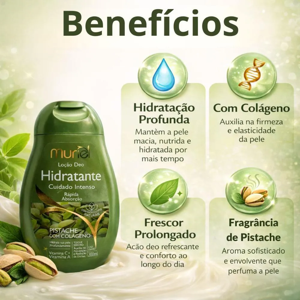 Descubra a experiência única da Loção Deo Hidratante Muriel Pistache Com Colágeno 200ml, um produto que une hidratação intensa, ação desodorante e uma fragrância sofisticada de pistache em um só item. Desenvolvida pela MURIEL, esta loção é perfeita para quem busca transformar a rotina de cuidados com a pele em um momento de puro bem-estar.Com sua fórmula enriquecida com colágeno, a loção proporciona hidratação profunda e duradoura, deixando a pele mais firme, elástica e com uma irresistível sensação de maciez e suavidade. Ideal para todos os tipos de pele e para uso unissex, ela garante frescor prolongado e rápida absorção, cuidando da sua pele desde a primeira aplicação.Benefícios Principais
