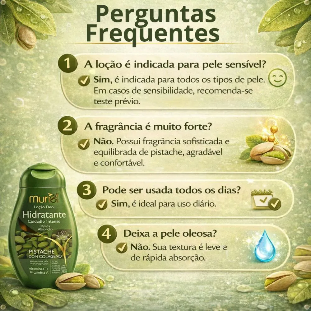 A Loção Deo Hidratante Muriel Pistache Com Colágeno é perfeita para o uso diário, seja após o banho para selar a hidratação ou a qualquer momento em que a pele necessite de um toque de maciez e frescor. Sua ação desodorante a torna ideal para manter a sensação de bem-estar ao longo do dia, enquanto a fragrância de pistache proporciona um aroma agradável e duradouro. É indicada para todos os tipos de pele e para o público unissex.Modo de Uso/Aplicação