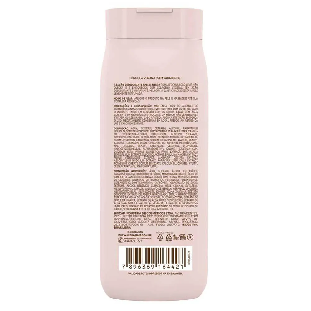 A Loção Desodorante Ameixa Negra possui formulação leve, não oleosa e é enriquecida com colágeno Vegetal, tem ação desodorante e hidratante. Melhora a elasticidade e deixa a pele levemente perfumada.