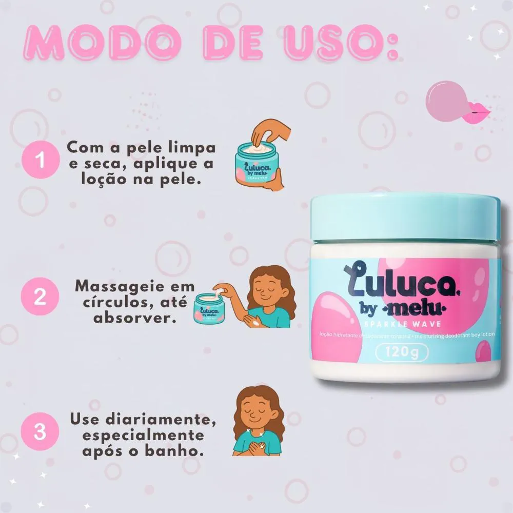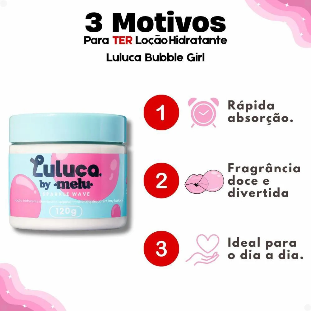 - Produto exclusivo da linha Luluca By Melu Sparkle Wave Bubble Girl, sinônimo de qualidade e confiança. - Embalagem prática e charmosa de 120g, perfeita para levar na bolsa e usar a qualquer hora, garantindo hidratação sempre à mão. - Fórmula suave e delicada, desenvolvida para proporcionar uma experiência sensorial única, com ingredientes que cuidam da pele com carinho.Ocasiões de Uso/Cenários Ideais