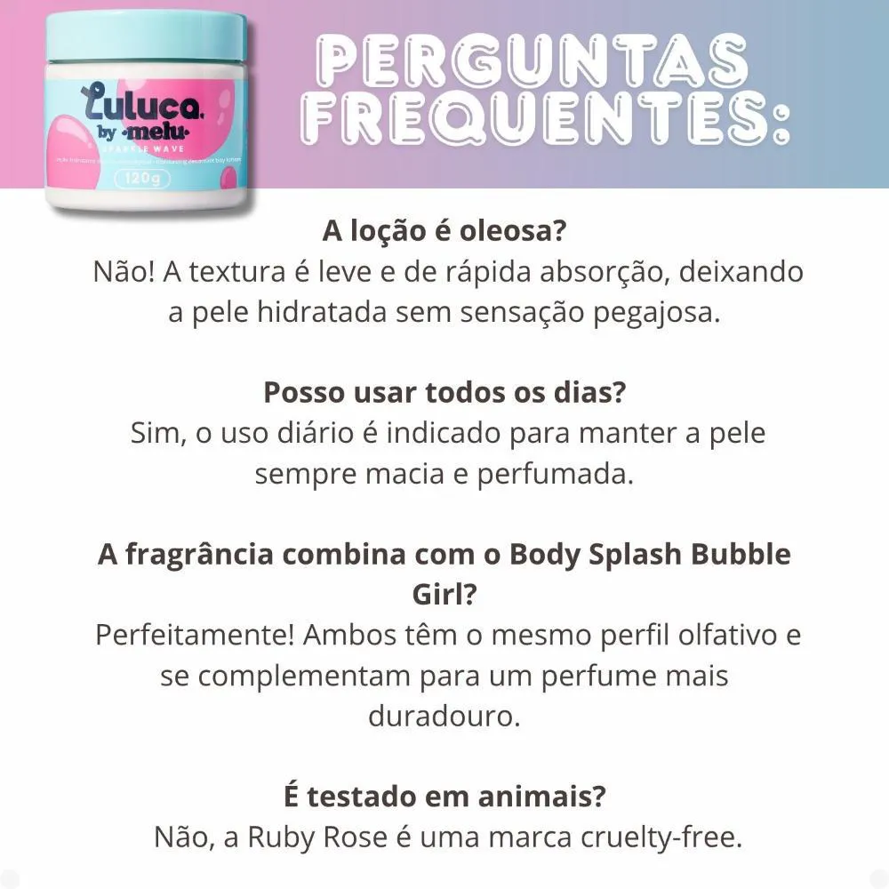 A Loção Hidratante Corporal Ruby Rose Luluca By Melu Sparkle Wave Bubble Girl é perfeita para usar diariamente após o banho, para selar a hidratação e deixar a pele com um toque aveludado e um perfume sutil que dura o dia todo. Ideal para momentos de cuidado pessoal, para relaxar e se sentir bem consigo mesma, ou para presentear alguém especial com um toque de carinho e diversão.Modo de Uso/Aplicação