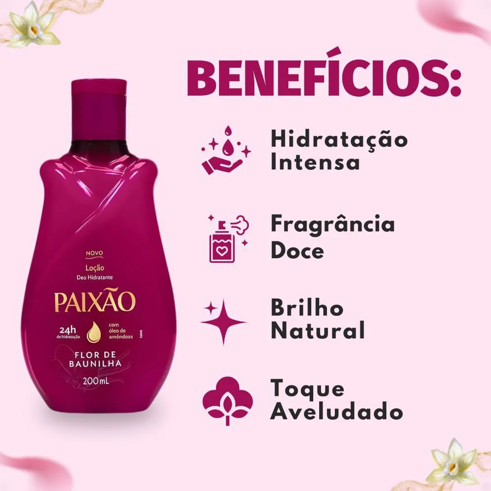 A Loção Hidratante Corporal Paixão Flor De Baunilha 200ml é a escolha perfeita para quem busca uma pele profundamente hidratada, macia e delicadamente perfumada. Desenvolvida para todos os tipos de pele, esta loção oferece uma experiência sensorial única, transformando o cuidado diário em um momento de puro prazer e bem-estar.Com sua fórmula enriquecida com óleo de amêndoas, a Loção Deo Hidratante Paixão Flor de Baunilha garante hidratação por até 24 horas e possui ação desodorante. A fragrância envolvente combina a doçura de frutas vermelhas como framboesa, amora silvestre, mirtilo e morango frescos com um buquê cremoso de rosa e jasmim, finalizando com notas caramelizadas, doces e amadeiradas. É a solução ideal para manter a pele nutrida, protegida e com um aroma irresistível ao longo do dia.Benefícios Principais