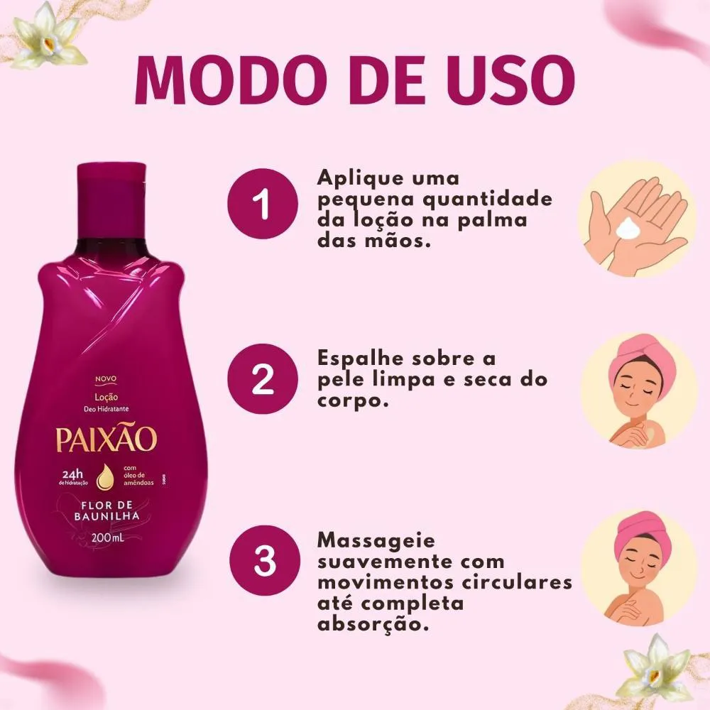 Aplique diariamente a Loção Hidratante Corporal Paixão Flor De Baunilha sobre a pele limpa e seca com massagem suave até completa absorção. Dê atenção especial às áreas mais ressecadas, como cotovelos e joelhos. Sinta o poder da fragrância e apaixone-se pela sua pele macia e perfumada. Para melhores resultados, utilize após o banho, com a pele ainda úmida.Anvisa: 25351.637330/2020-58