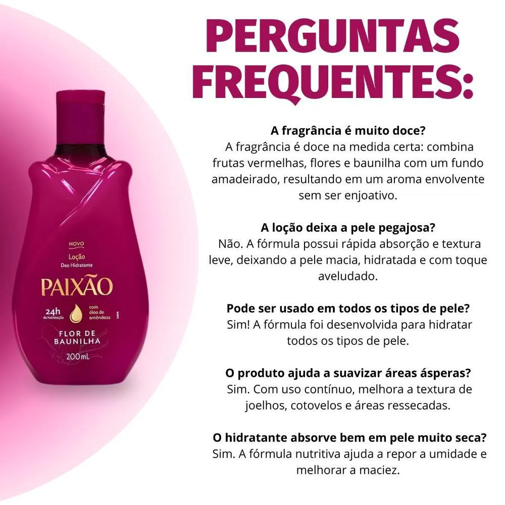 A Loção Hidratante Corporal Paixão Flor De Baunilha é ideal para o uso diário, após o banho, para iniciar o dia com a pele hidratada e perfumada, ou a qualquer momento em que sua pele necessite de um toque de maciez e um aroma agradável. Perfeita para quem busca um cuidado completo que une hidratação, perfumação e bem-estar. Use-a em momentos de relaxamento, antes de dormir, ou para se preparar para ocasiões especiais, garantindo uma pele radiante e um perfume irresistível.Modo de Uso/Aplicação