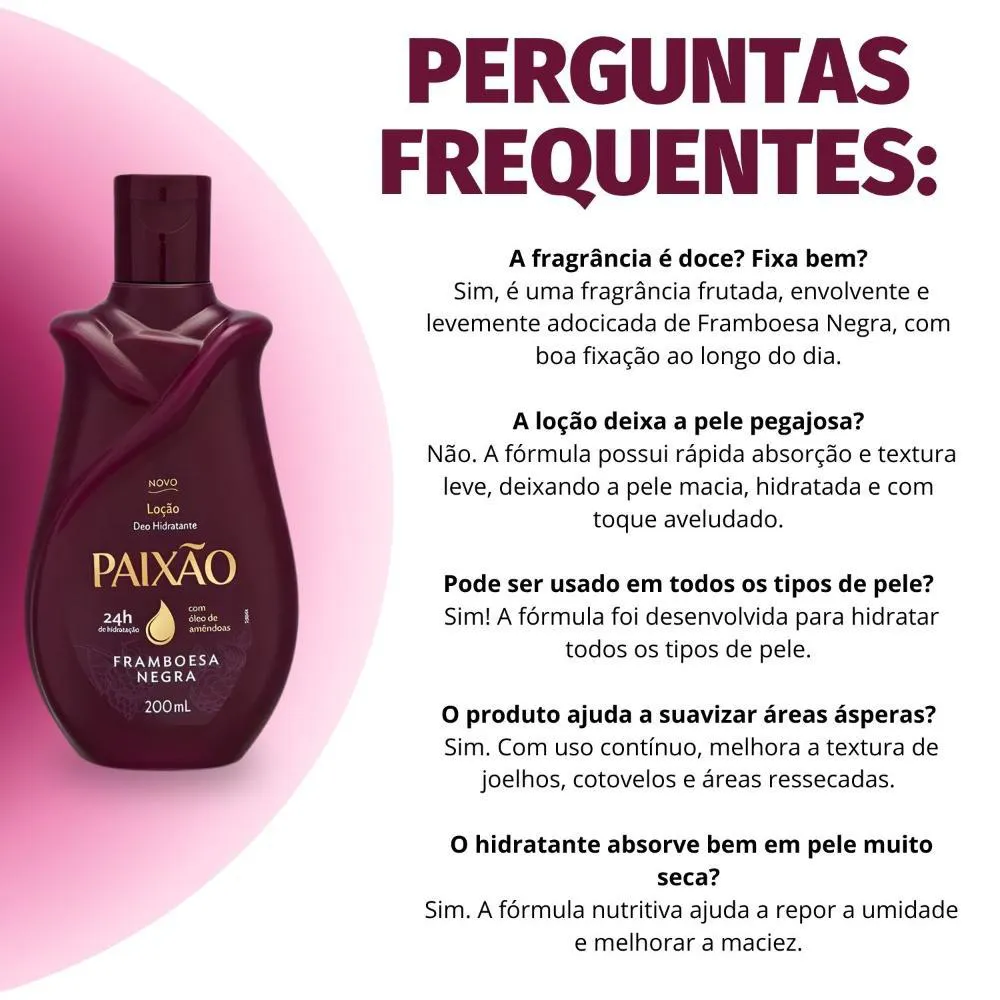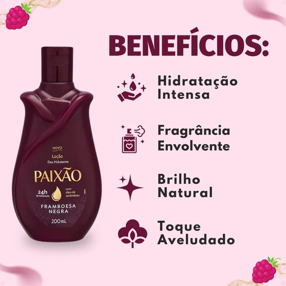 Descubra a experiência sensorial da Loção Hidratante Corporal Paixão Framboesa Negra 200ml, um produto da renomada marca PAIXÃO. Desenvolvida para proporcionar hidratação profunda e uma deliciosa fragrância de Framboesa Negra, esta loção corporal é ideal para quem busca uma pele macia, perfumada e com ação desodorante. Transforme seu ritual de cuidado diário em um momento de puro prazer e bem-estar, envolvendo-se em um aroma irresistível que dura por mais tempo.Benefícios Principais