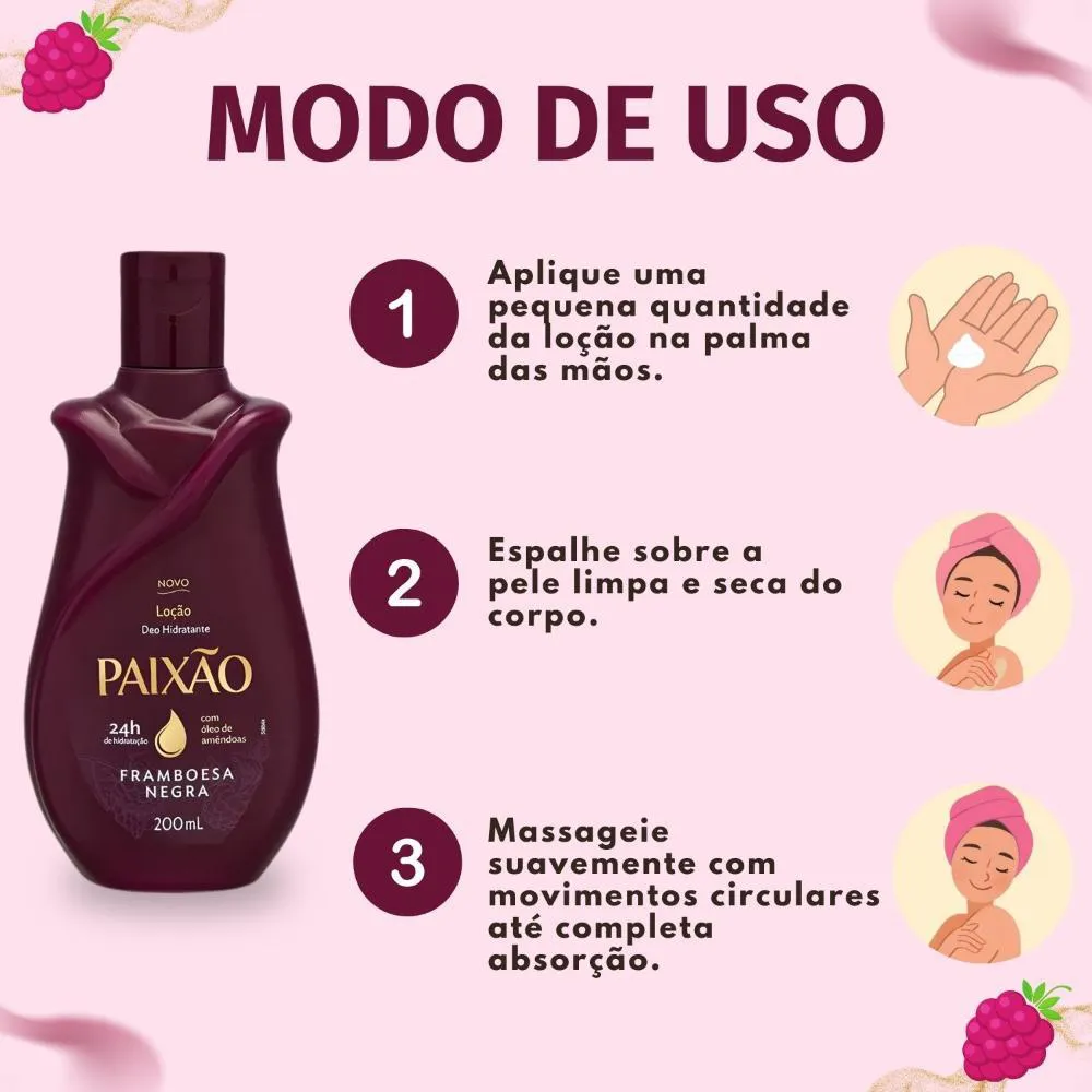 Aplique a Loção Hidratante Corporal Paixão Framboesa Negra sobre a pele limpa e seca, massageando suavemente com movimentos circulares até a completa absorção. Use diariamente, após o banho ou sempre que sentir necessidade de hidratação. Para melhores resultados, utilize em conjunto com outros produtos da linha PAIXÃO.Anvisa: 25351.637430/2020-84
