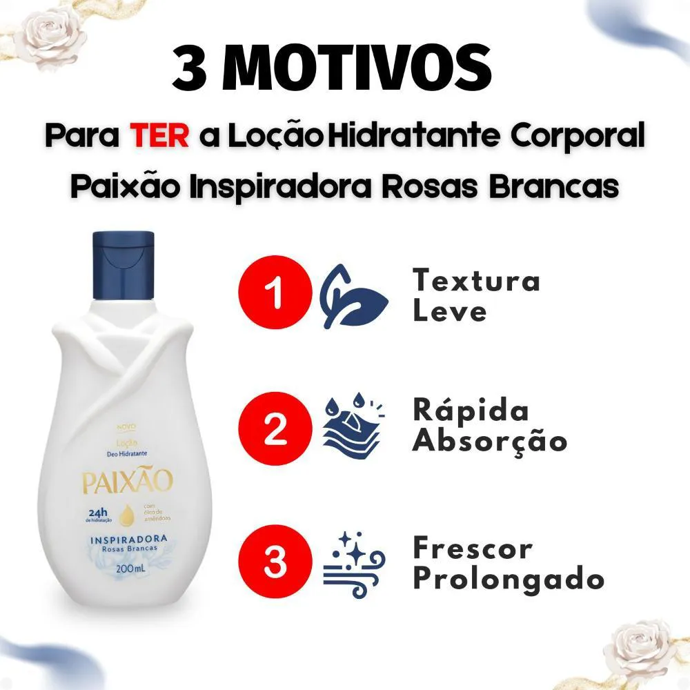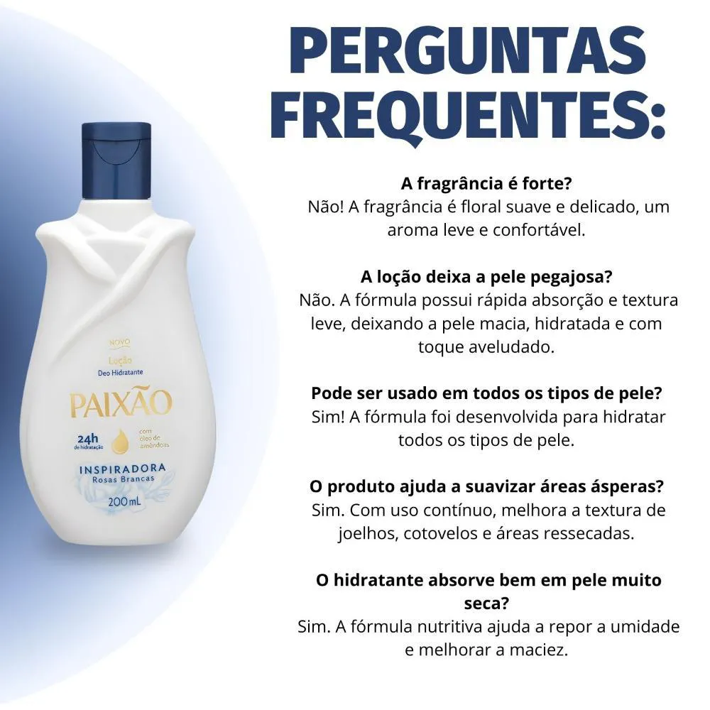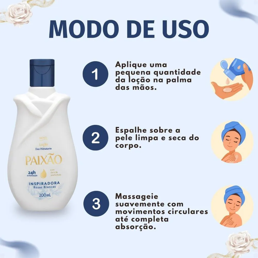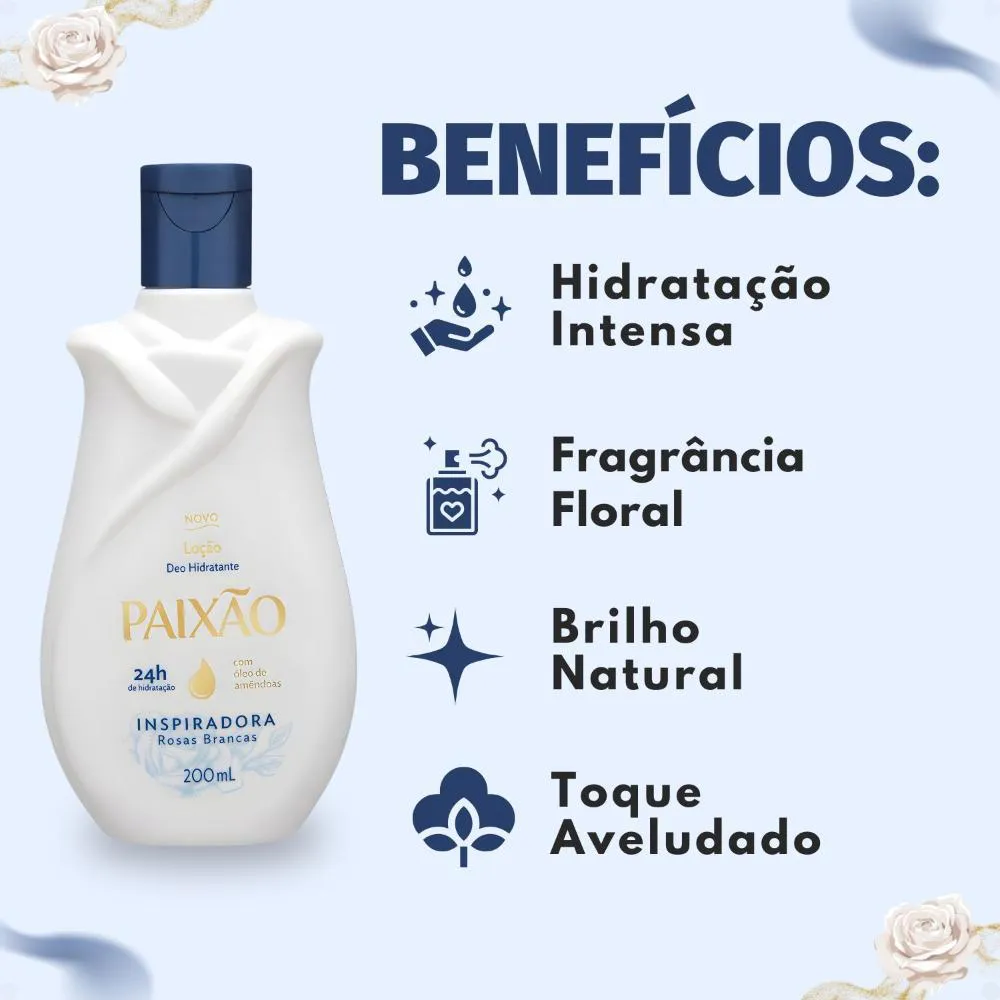 Descubra a experiência de uma pele profundamente hidratada e delicadamente perfumada com a Loção Hidratante Corporal Paixão Inspiradora Rosas Brancas 200ml. Desenvolvida pela renomada marca PAIXÃO, esta loção é a escolha perfeita para quem busca cuidado diário e uma sensação de bem-estar duradoura. Sua fórmula exclusiva, com a envolvente fragrância de Rosas Brancas, proporciona uma hidratação eficaz, deixando a pele macia, sedosa e com um toque irresistível. Ideal para mulheres que desejam realçar sua beleza natural e desfrutar de momentos de puro prazer, esta loção transformará sua rotina de cuidados com a pele em um ritual de carinho e sofisticação.Sinta a delicadeza das rosas brancas acariciando sua pele, enquanto a loção proporciona hidratação profunda e um perfume duradouro. A Loção Hidratante Paixão Rosas Brancas é um convite ao autocuidado e à celebração da sua beleza única.Benefícios Principais