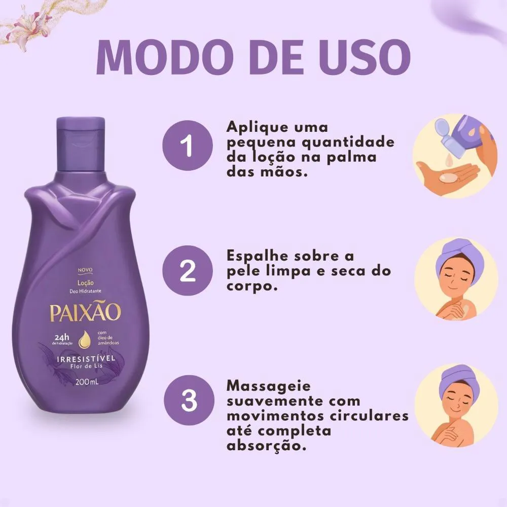 A Loção Hidratante Corporal Paixão Irresistível Flor De Lis é perfeita para ser incorporada à sua rotina diária de cuidados com a pele. Ideal para uso após o banho, quando a pele está mais receptiva à hidratação, ou a qualquer momento do dia em que você desejar uma sensação de frescor e uma pele suavemente perfumada. Excelente para manter a pele nutrida e com um aroma agradável em todas as estações, seja no trabalho, em casa ou em momentos de lazer.Modo de Uso/Aplicação: