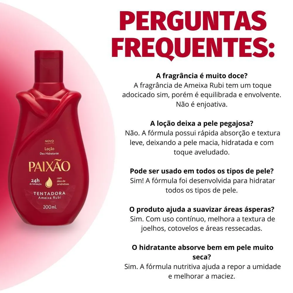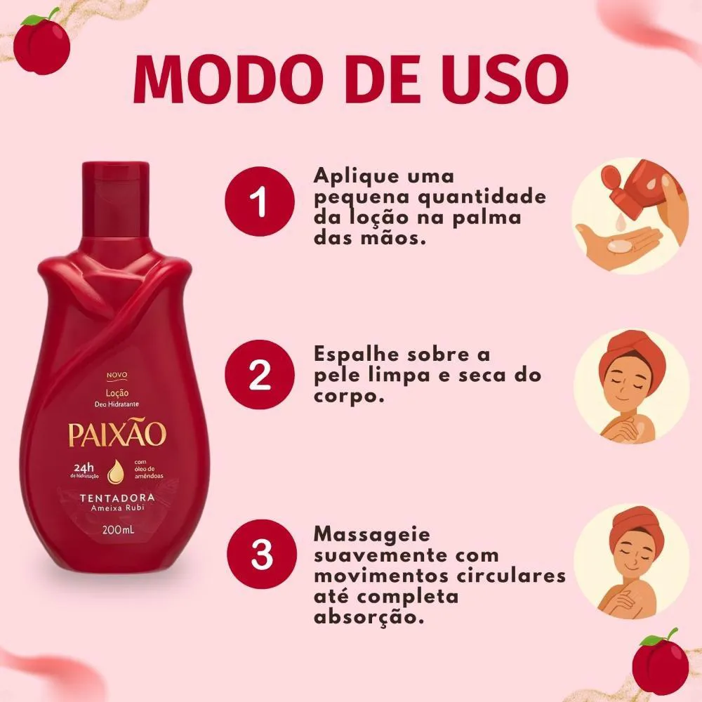 Perfeita para o uso diário, a Loção Hidratante Corporal Paixão Tentadora Ameixa Rubi é ideal para ser aplicada após o banho, antes de dormir ou sempre que a pele necessitar de hidratação e um toque de perfumação. Ideal para momentos de autocuidado, encontros românticos ou para simplesmente se sentir confiante e irresistível. Transforme seu ritual de autocuidado em um momento de prazer e sedução. Use-a em um spa day em casa, antes de sair para um encontro especial ou sempre que desejar uma pele macia e perfumada, elevando sua autoestima e bem-estar.Modo de Uso/Aplicação