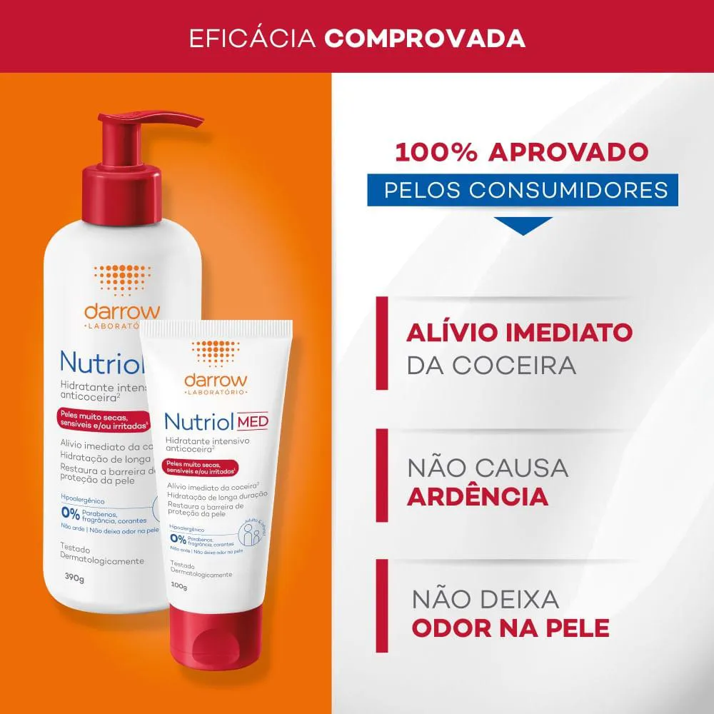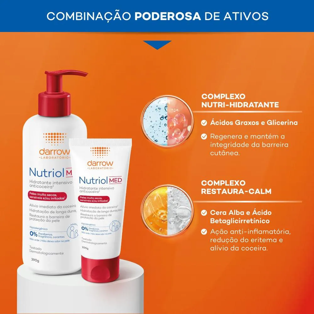 Sua fórmula exclusiva alia um complexo Nutri-hidratante (ácidos graxos + glicerina) que repara de forma duradoura e um Complexo Restaura-calm (cera alba + ácido betaglicirretínico) que acalma a pele imediatamente e restaura sua barreira de proteção. Com eficácia comprovada cientificamente, garante -89% de coceira no 1º uso. Nutriol MED é hipoalergênico e pode ser usado por adultos e crianças. Não arde e não deixa odor na pele. 0% de álcool, parabenos, fragrância e corantes.
