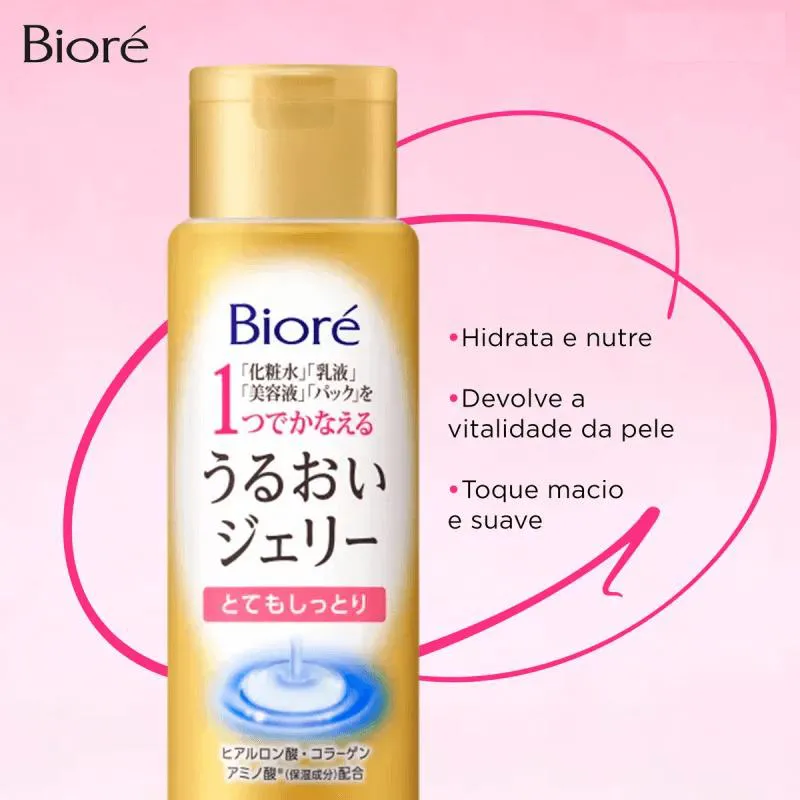 Loção hidratante intensa para todos os tipos de pele. Bioré Rich Moisture Jelly Lotion hidrata, nutre e mantém a estrutura da tez bonita e saudável enquanto une os 4 passos de skincare das japonesas em apenas 1 produto. Bioré Rich Moisture Jelly Lotion tem textura leve, em gel, que penetra profundamente na pele sem deixar a sensação pegajosa. Sua fórmula traz Ácido Hialurônico, colágeno e Aminoácidos com ingredientes hidratantes para preservar a umectação ideal e entregar uma aparência impecável, com toque macio e suave diariamente. Modo de usar: Após a limpeza, aplique a loção com as mãos diretamente no rosto e no pescoço.