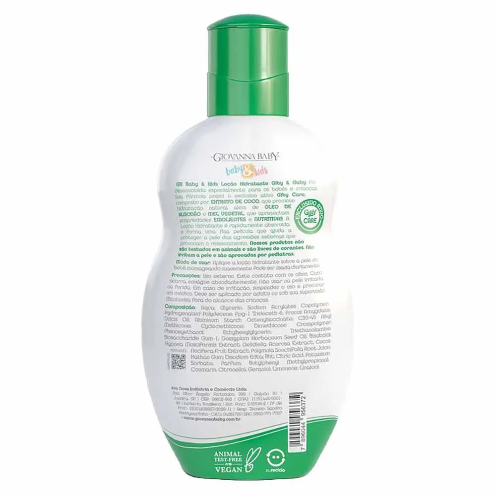 A Loção Hidratante Giby Giovanna Baby, foi especialmente desenvolvido para a pele sensível do bebê. Possui o exclusivo ativo “Giby Care”: Uma fórmula cuidadosamente enriquecida com extrato de coco, que promove hidratação natural; extrato de óleo de algodão, com propriedades emolientes, e “mel Vegetal”, com propriedades nutritivas. Sua fórmula suave é rapidamente absorvida, formando uma película que ajuda a proteger a pele do bebê das agressões externas que provocam o ressecamento. A linha Giby possui produtos não testados em animais e livre de corantes.