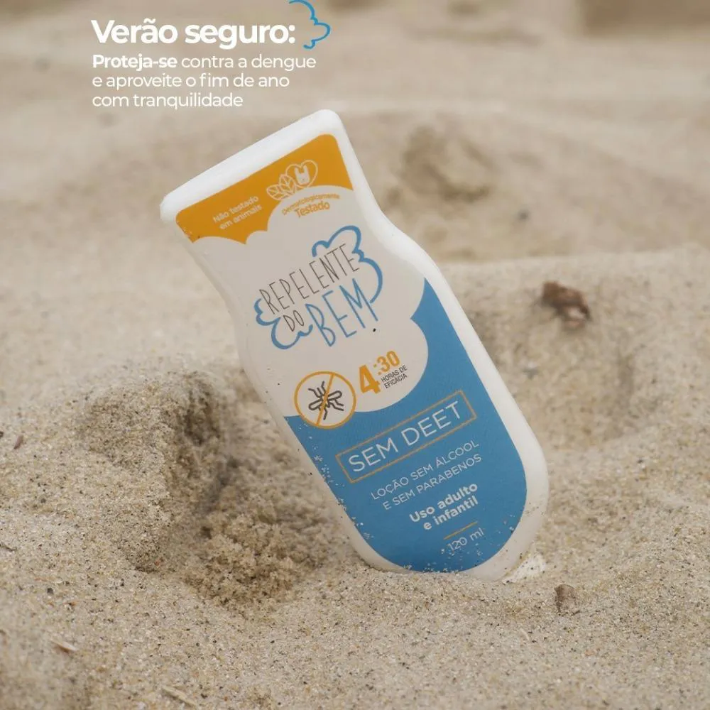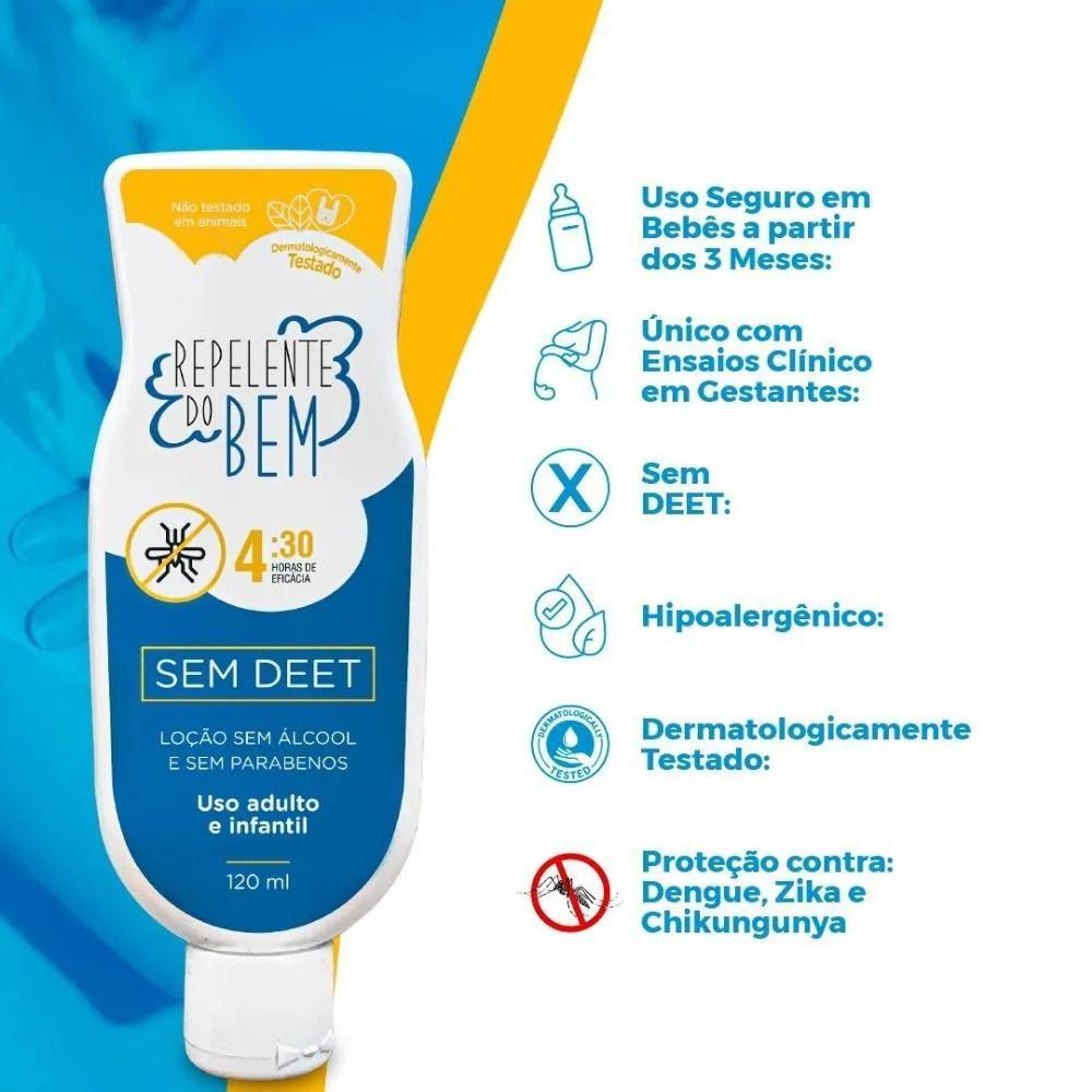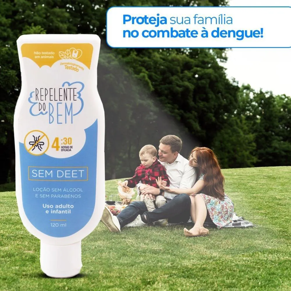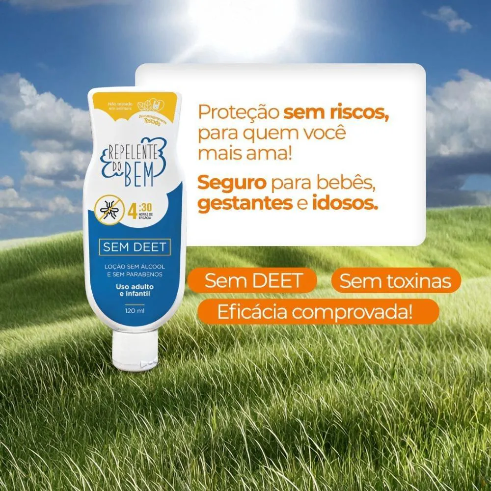 Loção Repelente do Bem 120ml - Proteção Eficaz Sem Álcool e Sem Deet A Loção Repelente do Bem 120ml é a escolha perfeita para proteger sua família contra mosquitos e outros insetos. Com uma fórmula inovadora sem álcool e sem Deet (componente químico N,N-dietil-meta-toluamida), este repelente é ideal para adultos e crianças, oferecendo segurança e conforto, mesmo para peles sensíveis. Desenvolvida com uma textura leve e de rápida absorção, a Loção Repelente do Bem não deixa a pele oleosa. Sua fragrância suave proporciona uma experiência agradável, garantindo proteção duradoura tanto em ambientes internos quanto externos. É o produto ideal para passeios, viagens, atividades ao ar livre e uso diário. Benefícios: