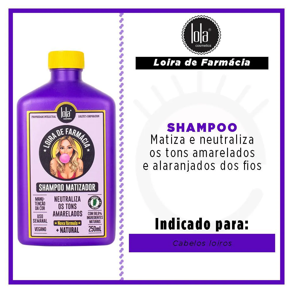 O Shampoo Matizador Loira de Farmácia da Lola Cosmetics matiza e neutraliza os tons amarelados e alaranjados dos fios, deixando os cabelos loiros revitalizados e mais brilhantes em apenas três lavagens.