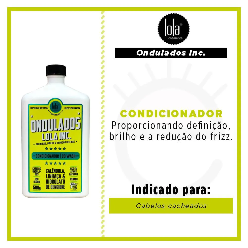 O Condicionador Ondulados Lola Inc co wash é um produto capilar desenvolvido especificamente para cabelos cacheados, com fórmula minimalista enriquecida com Extrato de Linhaça e Hidrolato de Gengibre. Serve para condicionar, higienizar e remover suavemente os resíduos dos fios, proporcionando definição, brilho e redução do frizz para cabelos ondulados. Além disso, oferece proteção térmica e solar, ajudando a modelar os fios com maciez e sedosidade, ativando as ondas naturais.