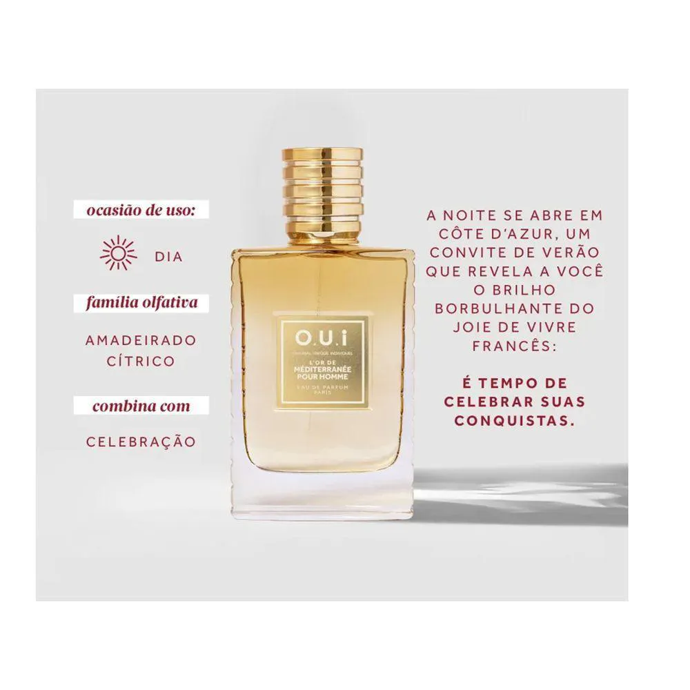 corpo aromático de fundo amadeirado.;A nova linha traz este Eau de Parfum com o ;acorde de espumante ;para representar o borbulhante ;joie de vivre* ;francês. ; L’Or de Mediterranée ;remete ao brilho das conquistas, combinado com nuances sofisticadas para te transportar diretamente ao verão Francês.;Para os que dizem a viver o verão e a celebrar as conquistas.;Família Olfativa: ;Amadeirado Cítrico ;;Nenhum produto é testado em animais, ou seja, este item possui selo Cruelty Free.