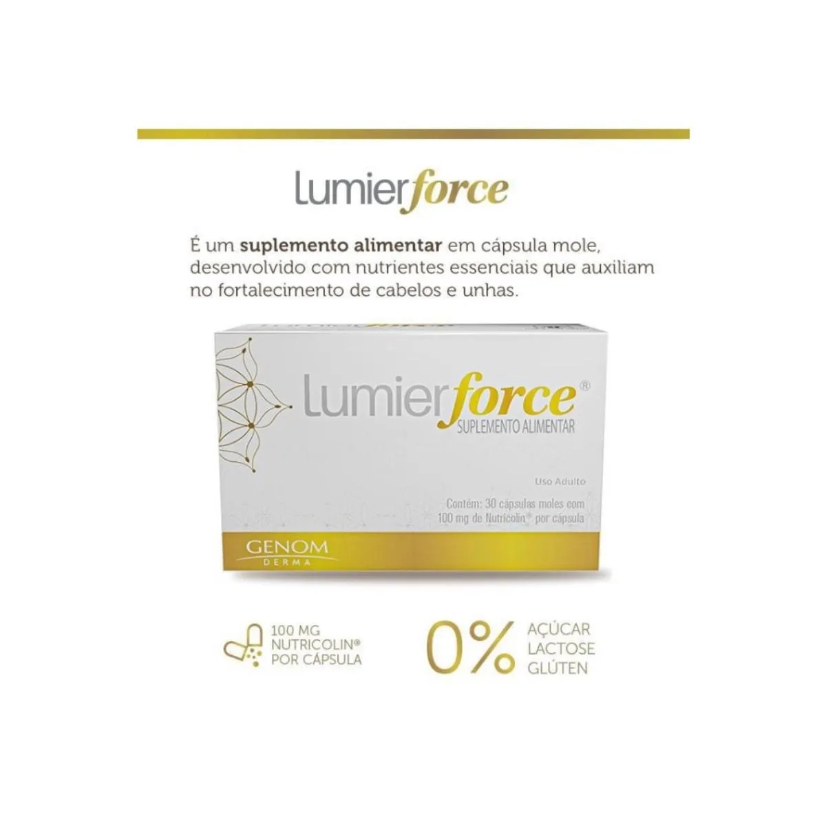 O Lumier Force é um suplemento alimentar composto por vitaminas, minerais, ômega 3 e silício orgânico, desenvolvido especificamente para nutrição capilar. Sua fórmula combina ingredientes como Nutricolin®, biotina, cisteína e outras vitaminas essenciais para a saúde dos cabelos e unhas.