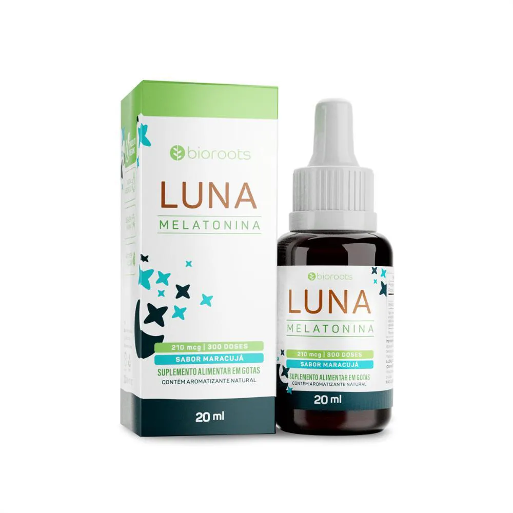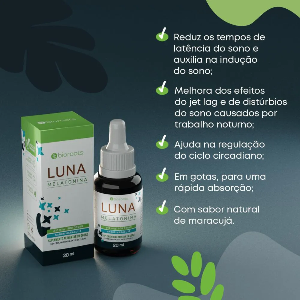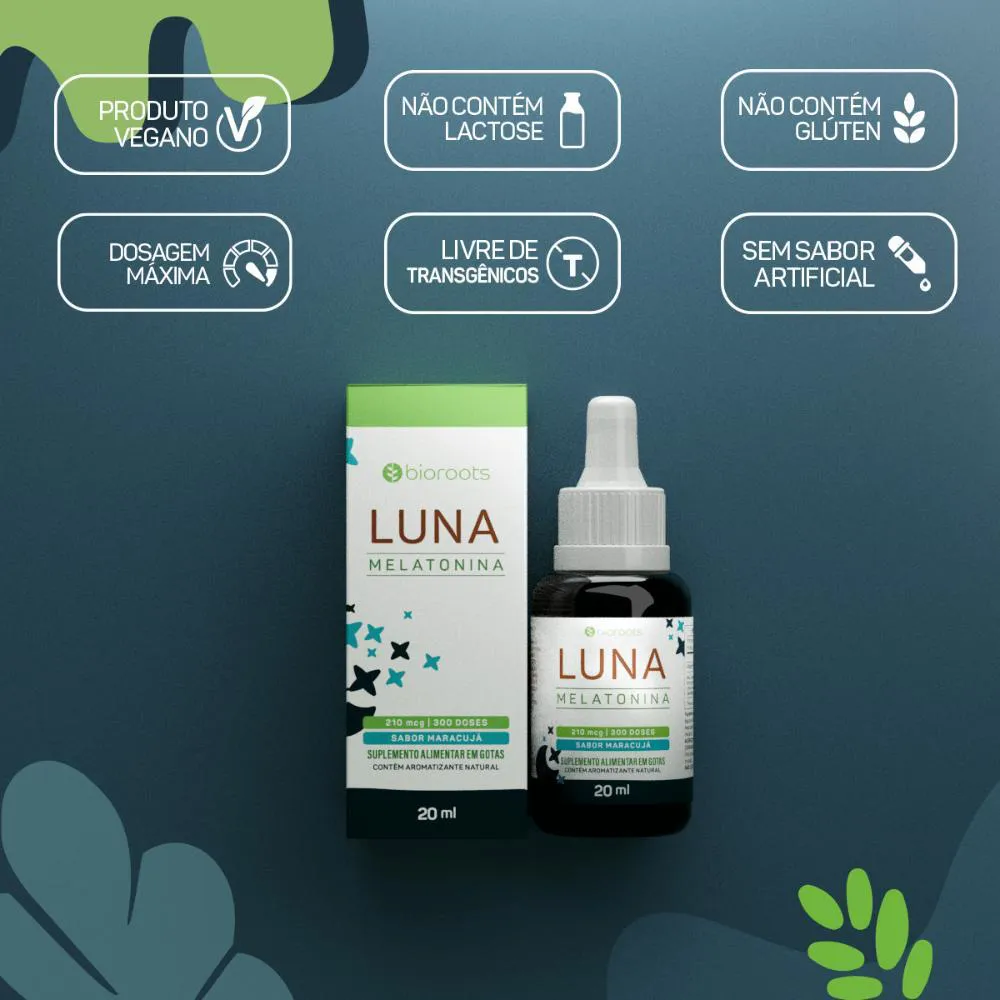 Suplemento alimentar em gotas de melatonina, a Luna Melatonina da Bioroots traz 210 mcg por gota em uma fórmula limpa, sem lactose, sem glúten e com aromas naturais. Desenvolvida para quem busca uma solução prática e natural para melhorar a qualidade do sono.